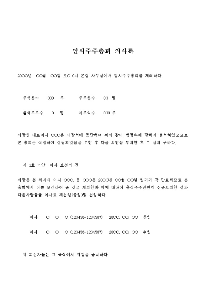 이사의 보선과 정관의 일부변경을 결의하는 임시주주총회의 의사록입니다.