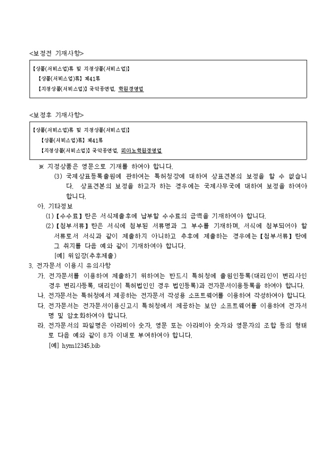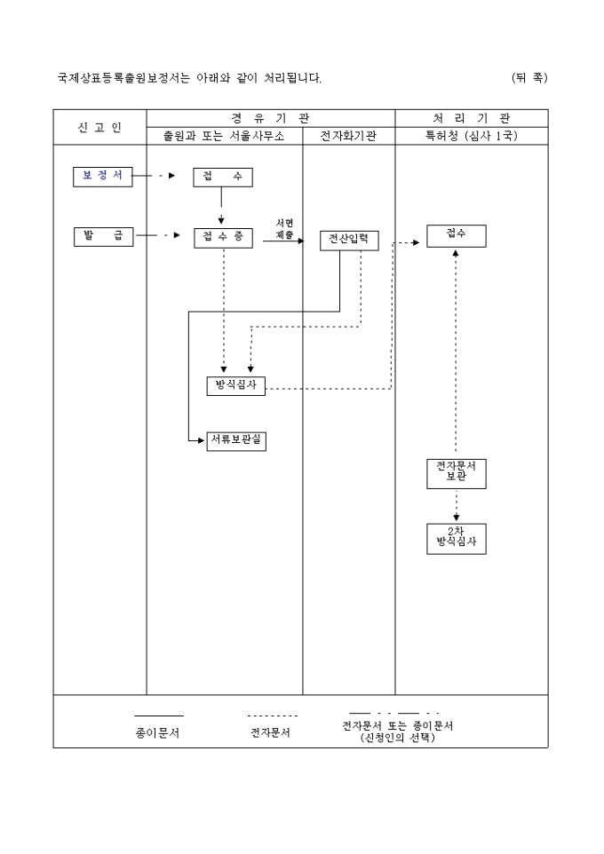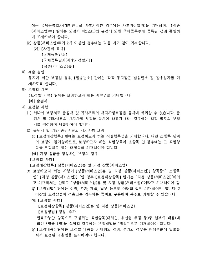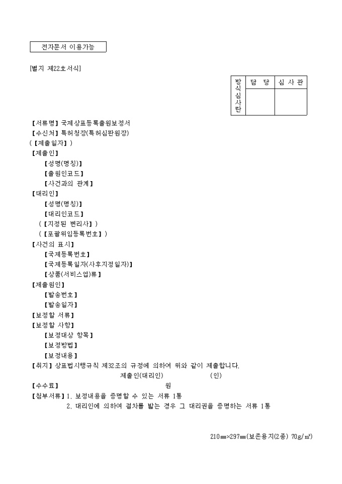 상표법시행규칙 제32조의 규정에 의거한 국제상표등록출원보정서입니다. 보정내용을 증명할 수 있는 서류 1통, 대리인에 의하여 절차를 밟는 경우에는 그 대리권을 증명하는 서류 1통이 첨부되어야 합니다.
