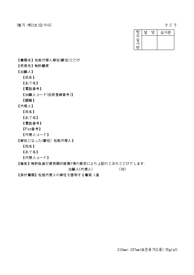 9,000원/월이 서식은 특허청에서 사용되는 [별지 제53호의2서식]포괄대리인해임로서 일어(한문)으로 작성되어 있습니다.