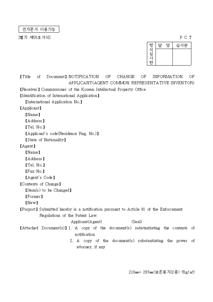 9,000원/월이 서식은 특허청에서 사용되는 [별지 제55호서식]NOTIFICATION OF CHANGE OF[NAME(TITLE)·ADDRESS·COUNTRY OF NATIONALITY·SEAL IMPRESSION] OF [APPLICANT·AGENT·COMMON REPRESENTATIVE·INVENTOR]로서 영문으로 작성되어 있습니다.
