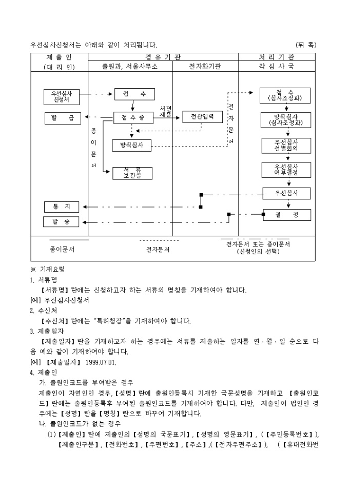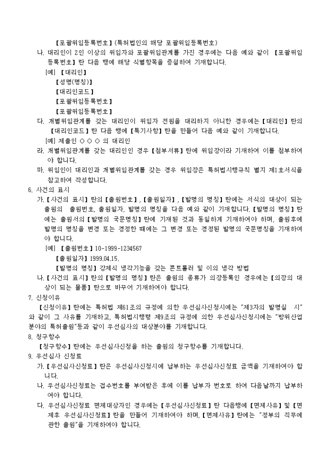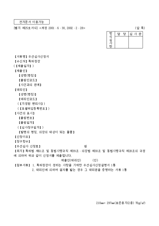 9,000원/월특허법 제61조 및 동법시행규칙 제39조ㆍ의장법 제30조 및 동법시행규칙 제28조의 규정에 의거한 우선심사신청서 입니다. 특허청장이 정하는 사항을 기재한 우선심사신청설명서 1통, 대리인에 의하여 절차를 밟는 경우 그 대리권을 증명하는 서류 1통이 첨부되어야 합니다.