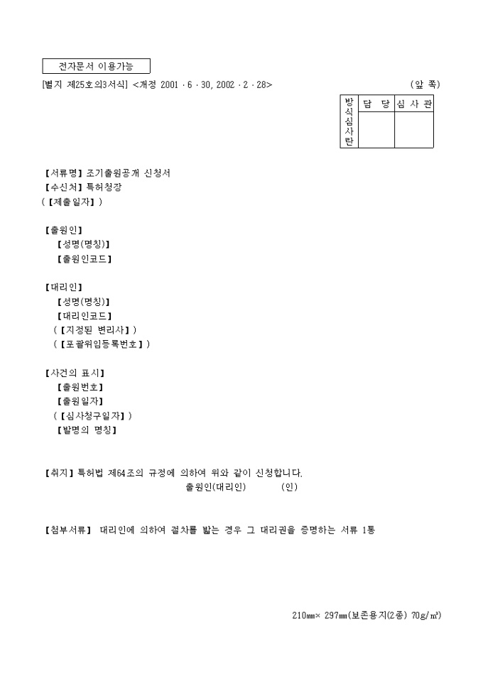 특허법 제64조의 규정에 의거한 조기출원공개신청서입니다. 대리인에 의하여 절차를 밟는 경우 그 대리권을 증명하는 서류 1통이 첨부되어야 합니다.