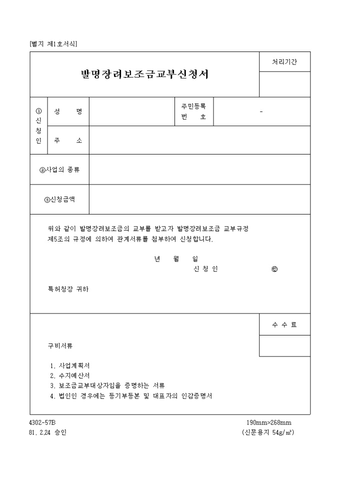 이 서식은 특허청에서 사용되는 [별지제1호]발명장려보조금교부신청서로서 81년 2월 24일 승인된 서식입니다.