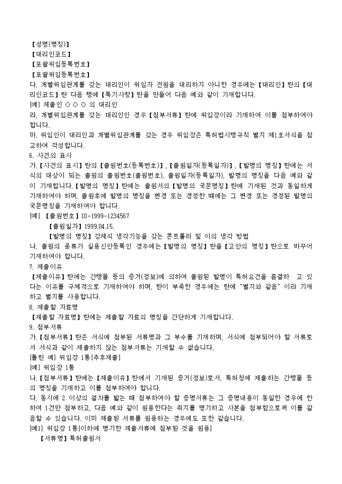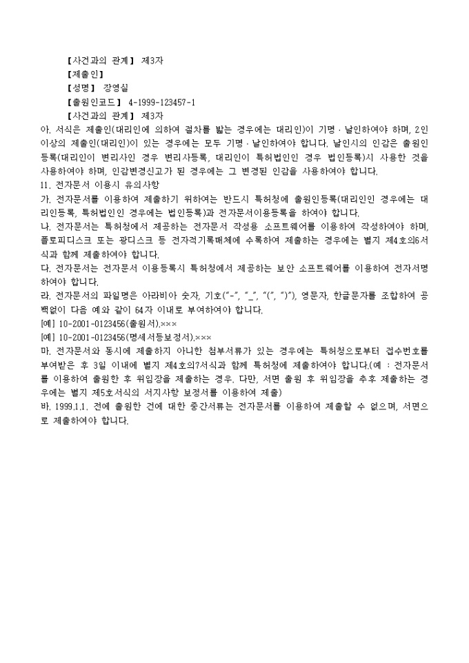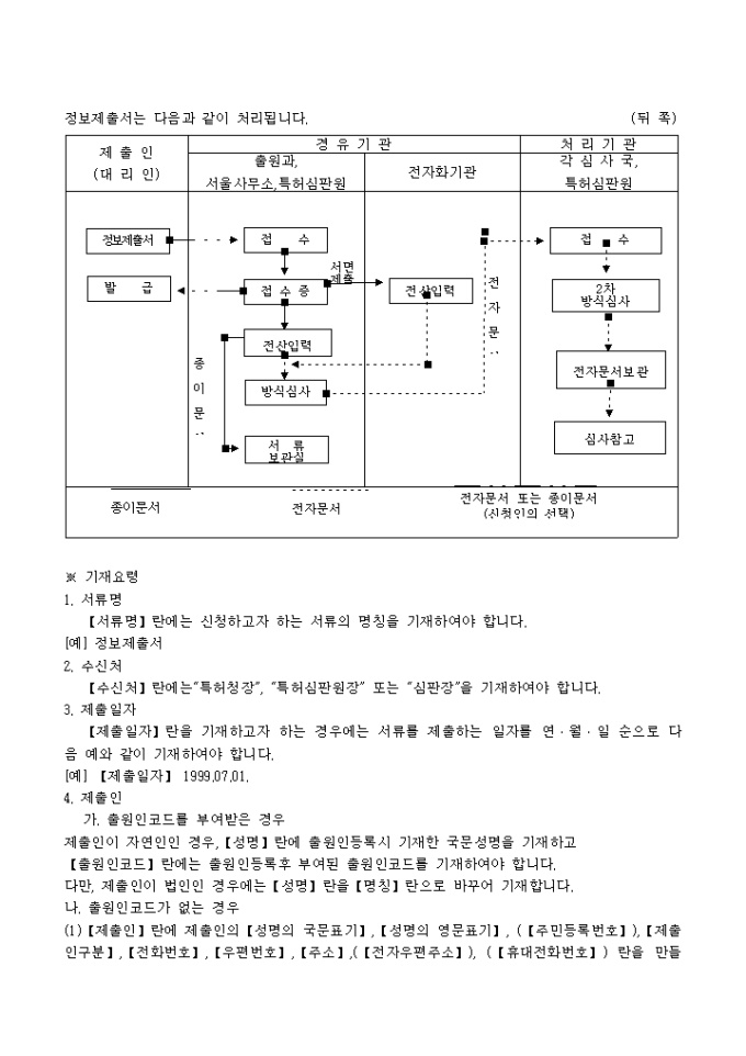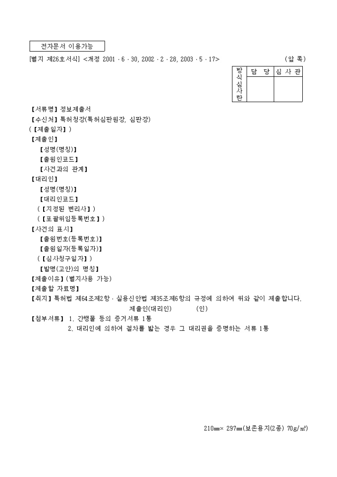 특허법 제64조제2항ㆍ실용신안법 제35조제6항의 규정에 의거한 정보제출서입니다. 간행물 등의 증거서류 1통, 대리인에 의하여 절차를 밟는 경우 그 대리권을 증명하는 서류 1통이 첨부되어야 합니다.