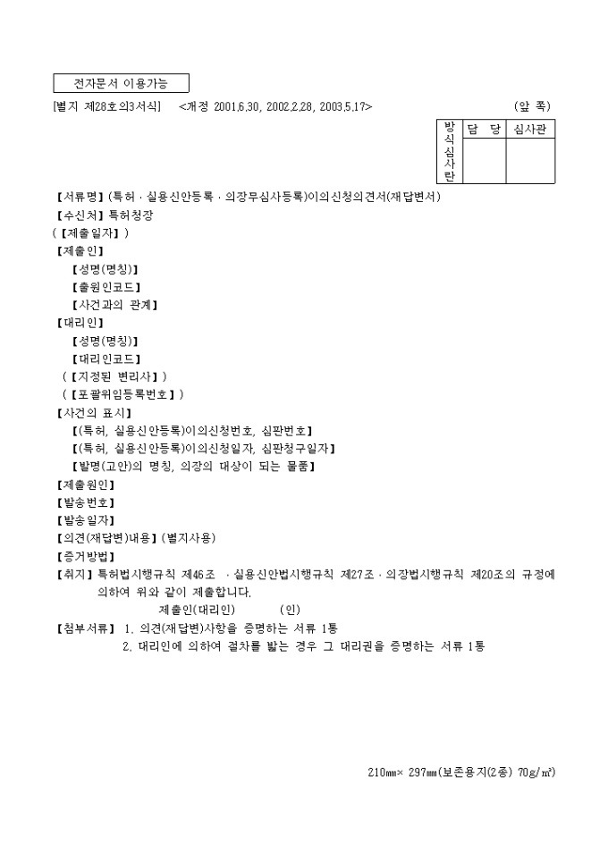 9,000원/월이 서식은 특허청에서 사용되는 [별지제28호3](특허.실용신안등록.의장무심사등록)이의신청의견서(재답변서)로서 03년 5월 17일에 개정되었습니다.