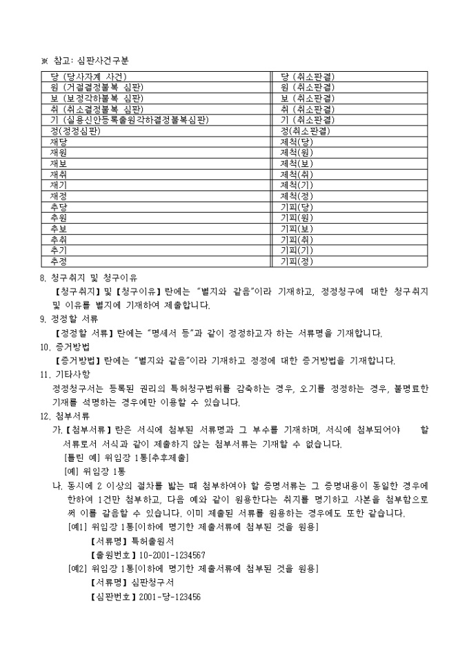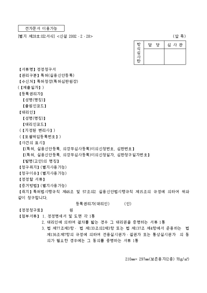 특허법시행규칙 제46조 및 57조의2 실용신안법시행규칙 제15조의 규정에 의거한 정정청구서입니다. 정정명세서 및 도면 각 1통, 대리인에 의하여 절차를 밟는 경우 그 대리권을 증명하는 서류 1통, 법 제77조제3항· 법 제133조의2제3항 또는 법 제137조 제4항에서 준용하는 법 제136조제7항의 규정에 의하여 전용실시권자·질권자 또는 통상실시권자의 동의가 필요한 경우에는 그 동의를 중명하는 서류 1통이 첨부되어야 합니다.