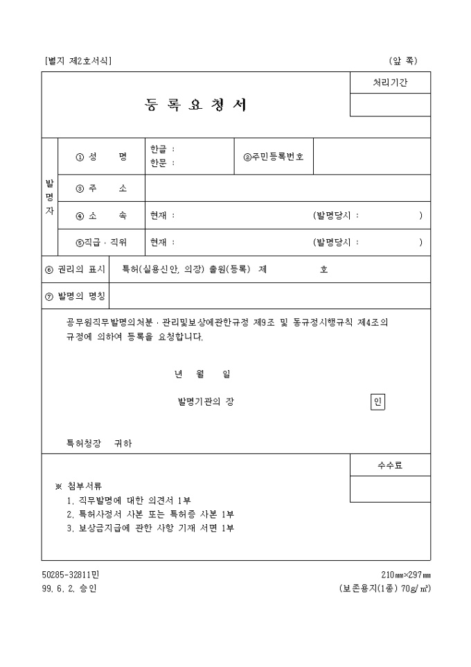 이 서식은 [별지제2호서식]등록요청서로서 필요한 서류로는 직무발명에 대한 의견서 1부, 특허사정서 사본 또는 특허증 사본 1부, 보상금지급에 관한 사항 기재 서면 1부이 있습니다.