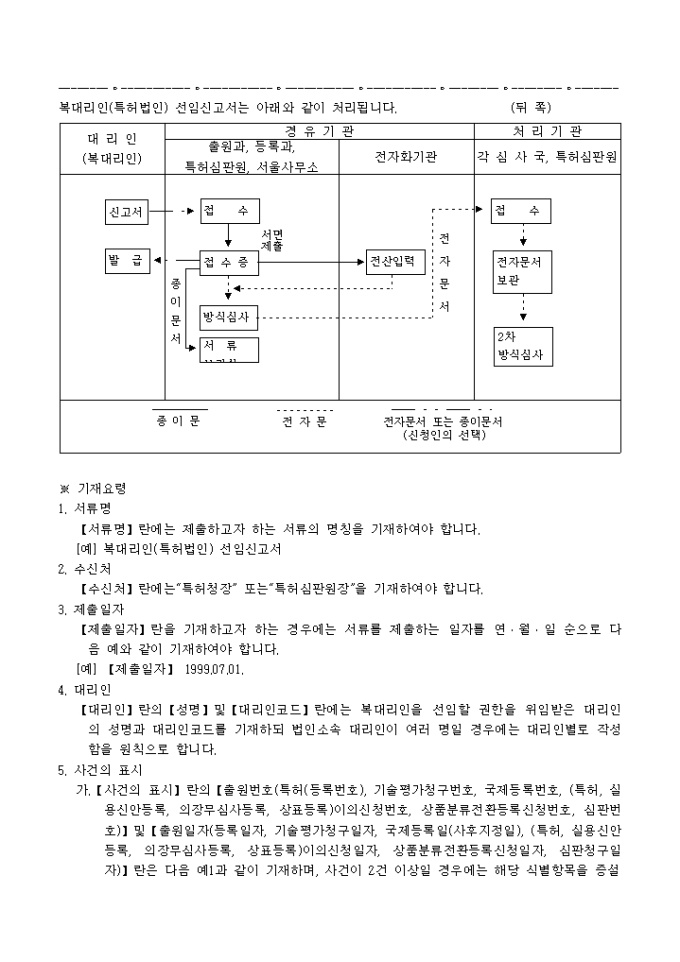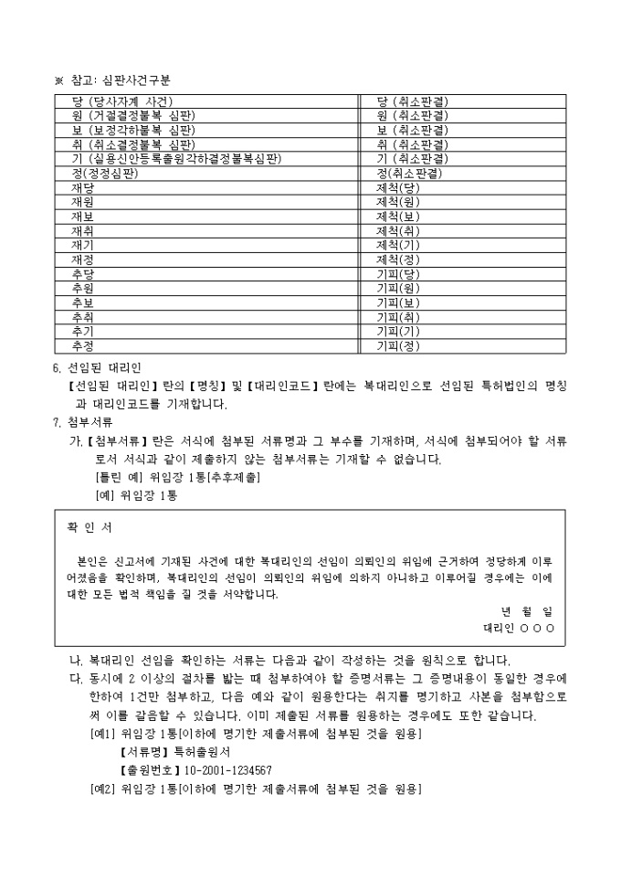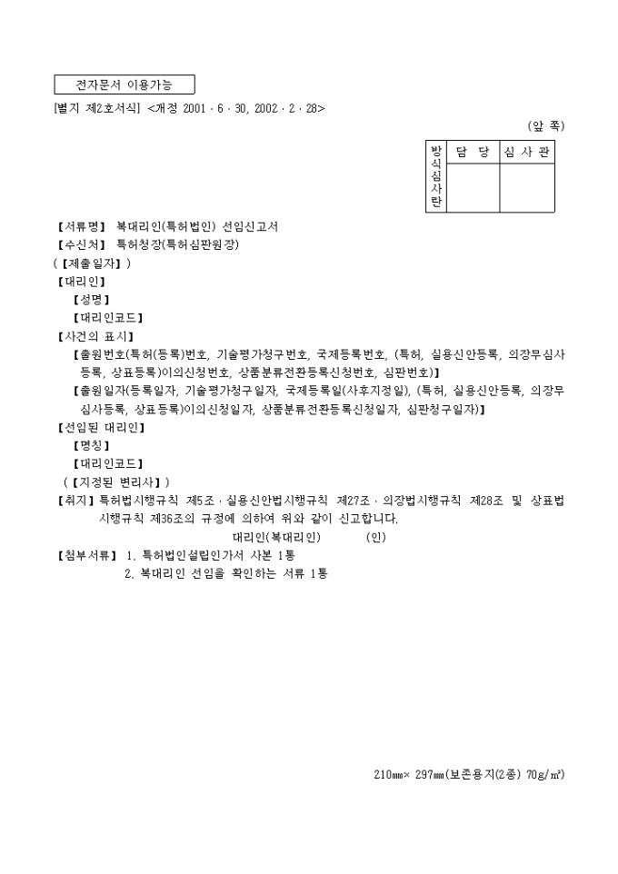 9,000원/월특허법시행규칙 제5조ㆍ실용신안법시행규칙 제27조ㆍ의장법시행규칙 제28조 및 상표법시행규칙 제36조의 규정에 의거한 복대리인(특허법인)선임신고서로서 특허법인설립인가서 사본 1통, 복대리인 선임을 확인하는 서류 1통이 첨부되어야 합니다.