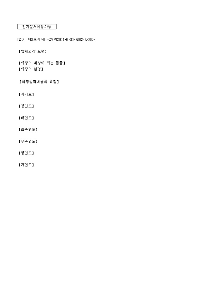 9,000원/월이 서식은 특허청에서 사용되는 [별지제3호]입체의장 도면입니다.
