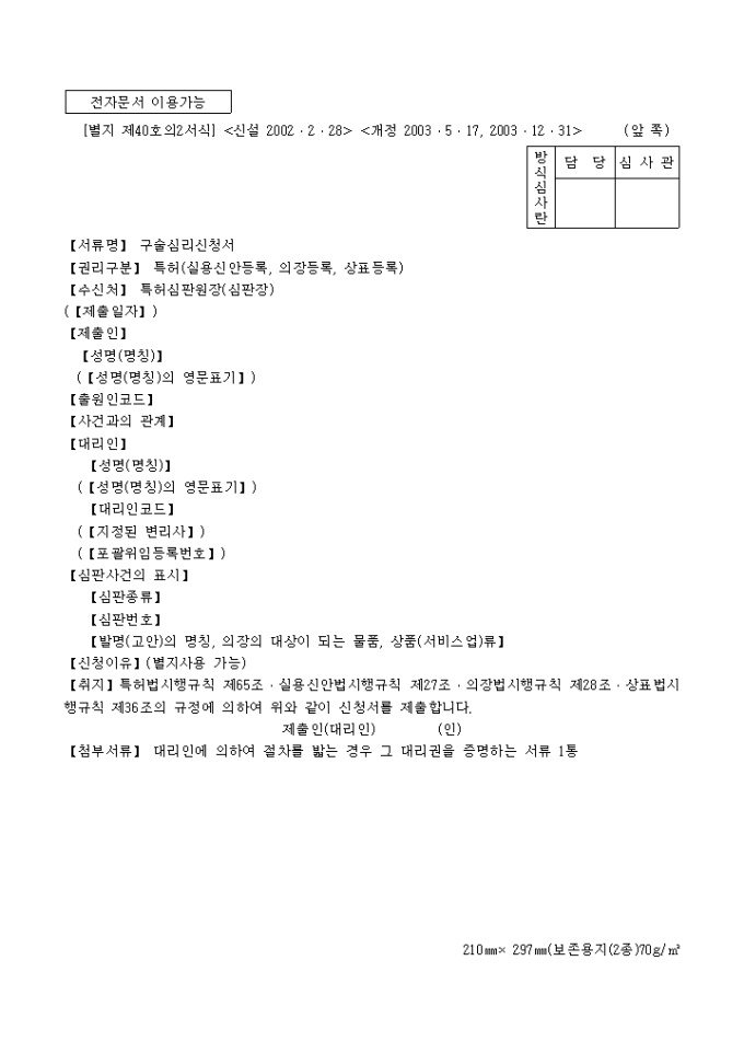 9,000원/월이 서식은 특허청에서 사용되는 [별지제40호2]구술심리신청서로서 필요한 서류로는 대리인에 의하여 절차를 밟는 경우 그 대리권을 증명하는 서류 1통이 있습니다.