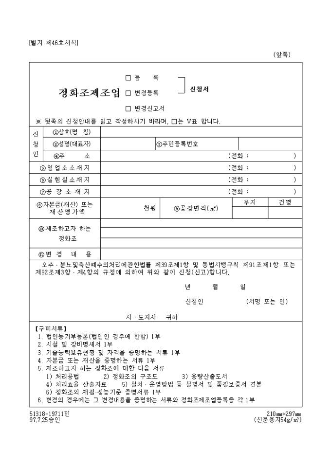정화조제조업(등록, 변경등록)신청서, 변경신고서