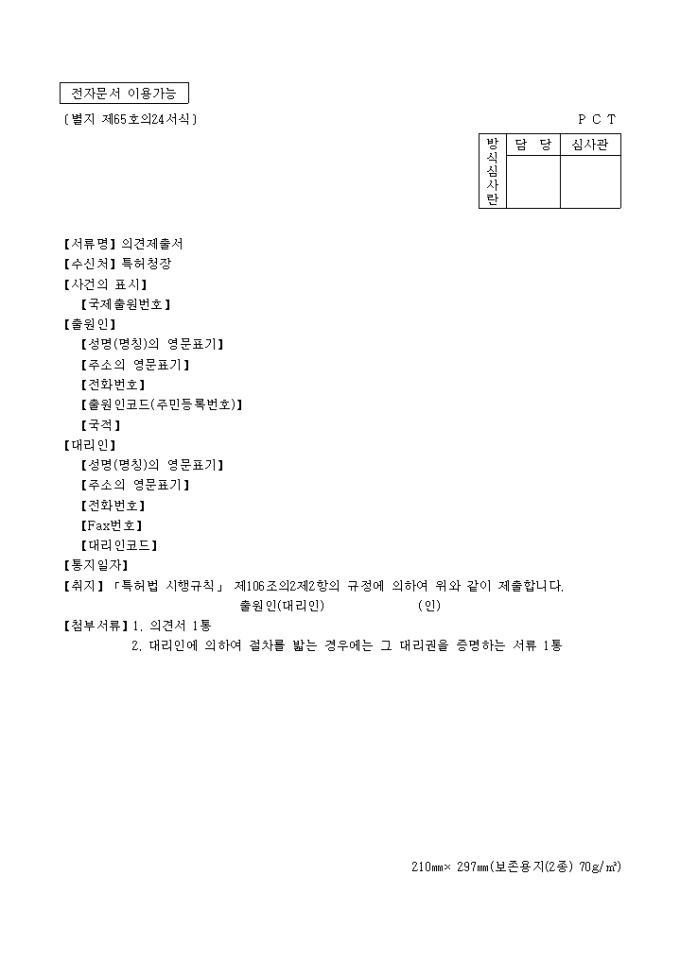 이 서식은 특허청에서 사용되는 별지 제 65호의 24서식으로 의견 제출서 입니다.