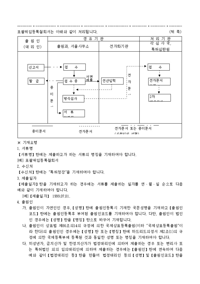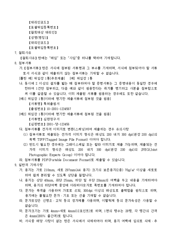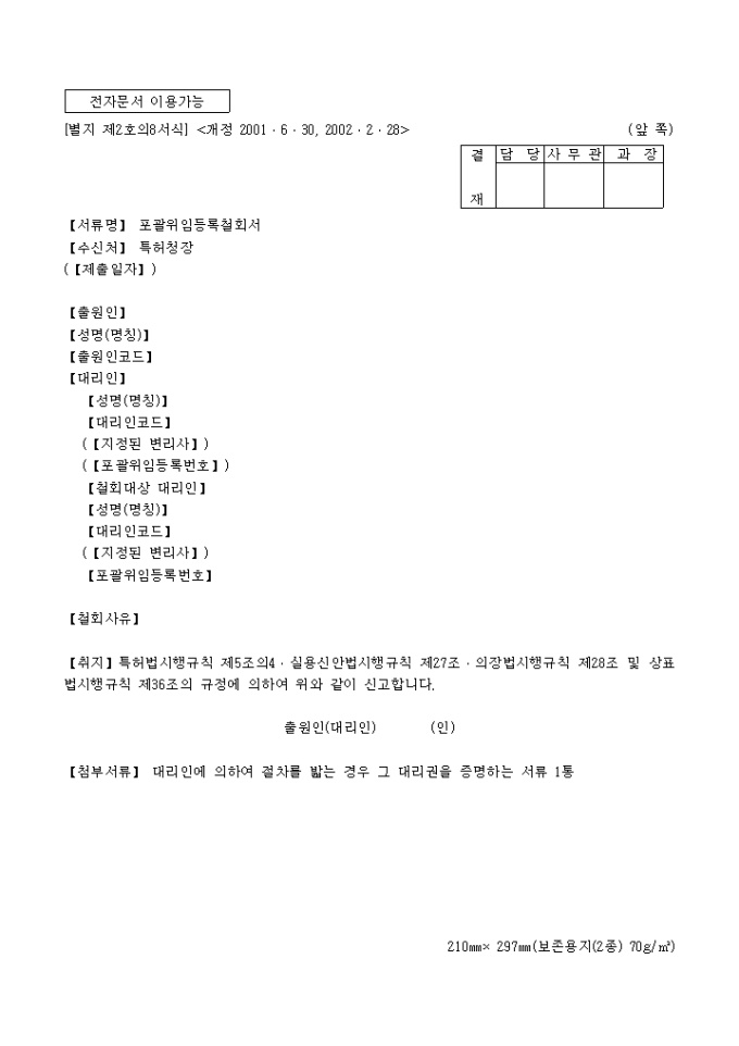 9,000원/월특허법시행규칙 제5조의4·실용신안법시행규칙 제27조·의장법시행규칙 제28조 및 상표법시행규칙 제36조의 규정에 의거한 포괄위임등록철회서 입니다. 대리인에 의하여 절차를 밟는 경우 그 대리권을 증명하는 서류 1통이 첨부되어야 합니다.