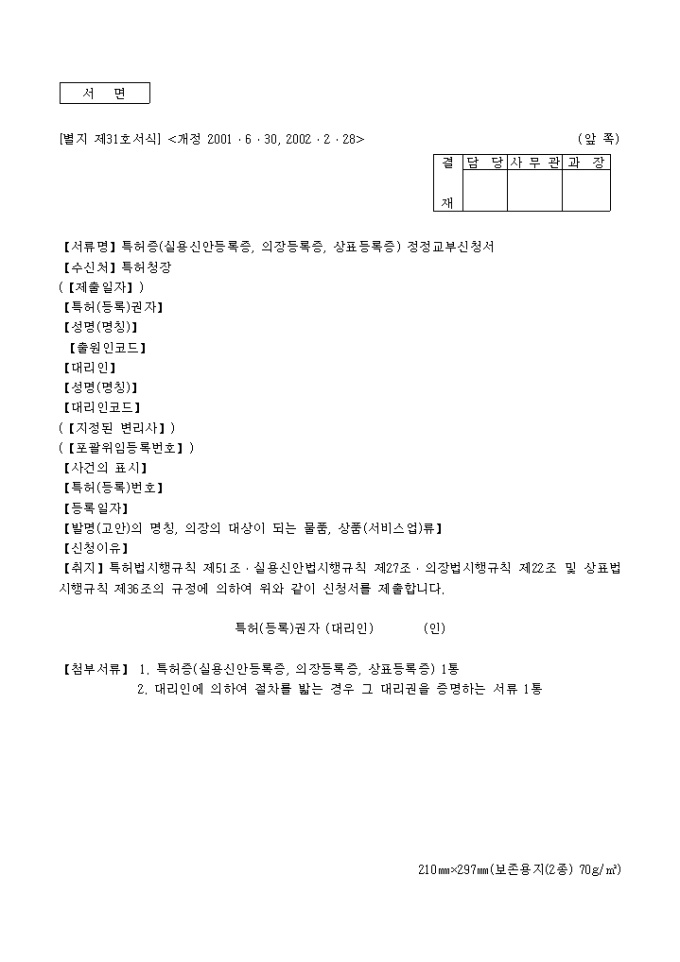 특허증(실용신안등증, 의장등록증, 상표등록증)정정교부신청서(별지 제31호서식)