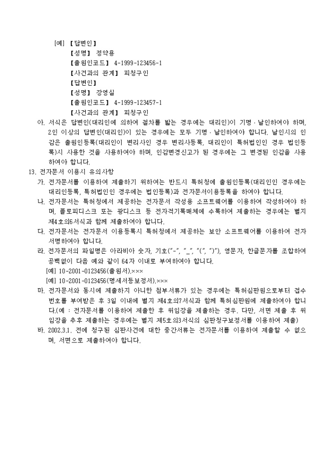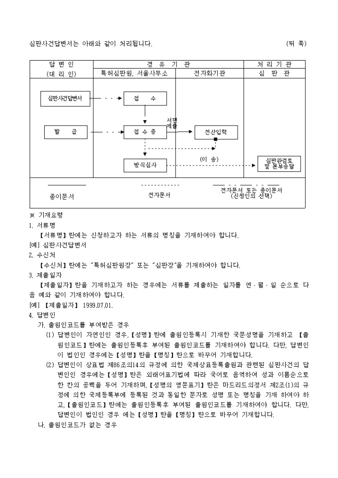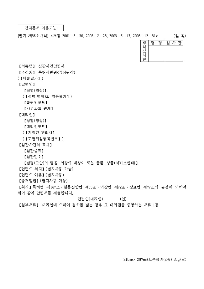 9,000원/월특허법 제147조·실용신안법 제56조·의장법 제72조·상표법 제77조의 규정에 의거한 심판사건 답변서입니다. 대리인에 의하여 절차를 밟는 경우 그 대리권을 증명하는 서류 1통이 첨부되어야 합니다.