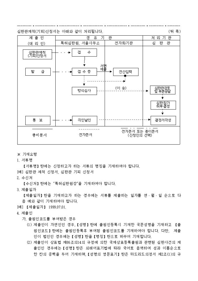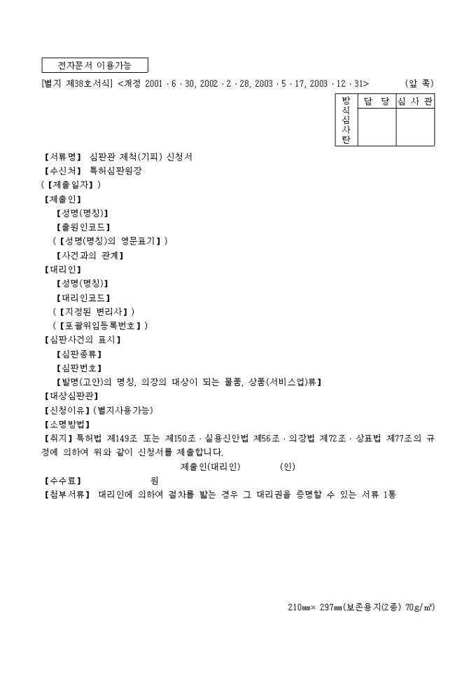 9,000원/월특허법 제149조 또는 제150조·실용신안법 제56조·의장법 제72조·상표법 제77조의 규정에 의거한 심판관제척(기피)신청서 입니다. 대리인에 의하여 절차를 밟는 경우 그 대리권을 증명할 수 있는 서류 1통이 첨부되어야 합니다.
