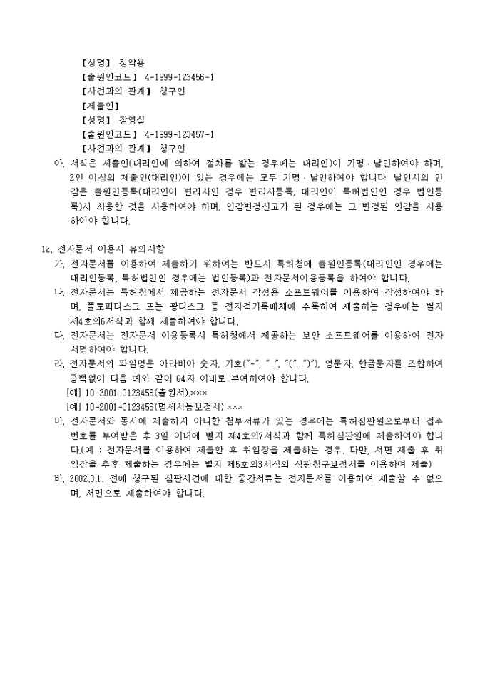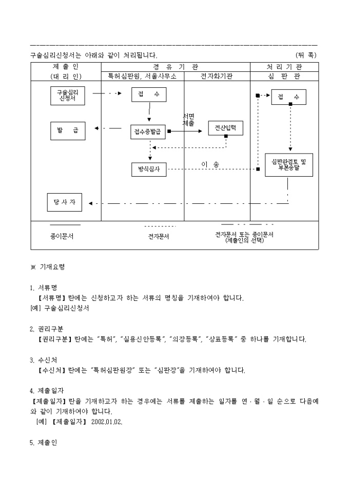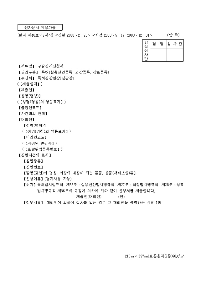 9,000원/월특허법시행규칙 제65조·실용신안법시행규칙 제27조·의장법시행규칙 제28조·상표법시행규칙 제36조의 규정에 의거한 구술심리신청서 입니다. 대리인에 의하여 절차를 밟는 경우 그 대리권을 증명하는 서류 1통이 첨부되어야 합니다.