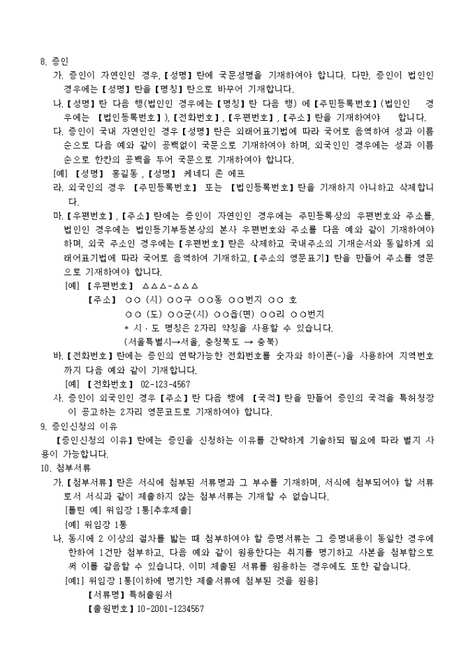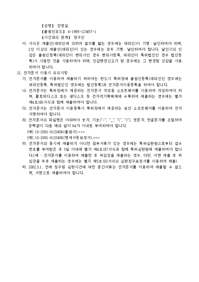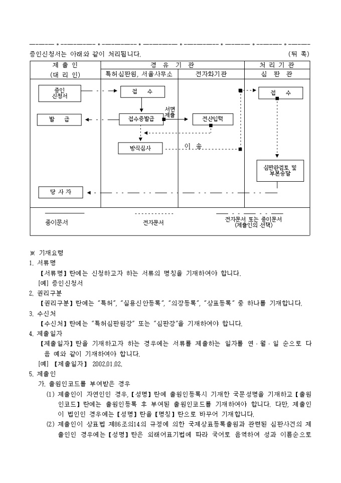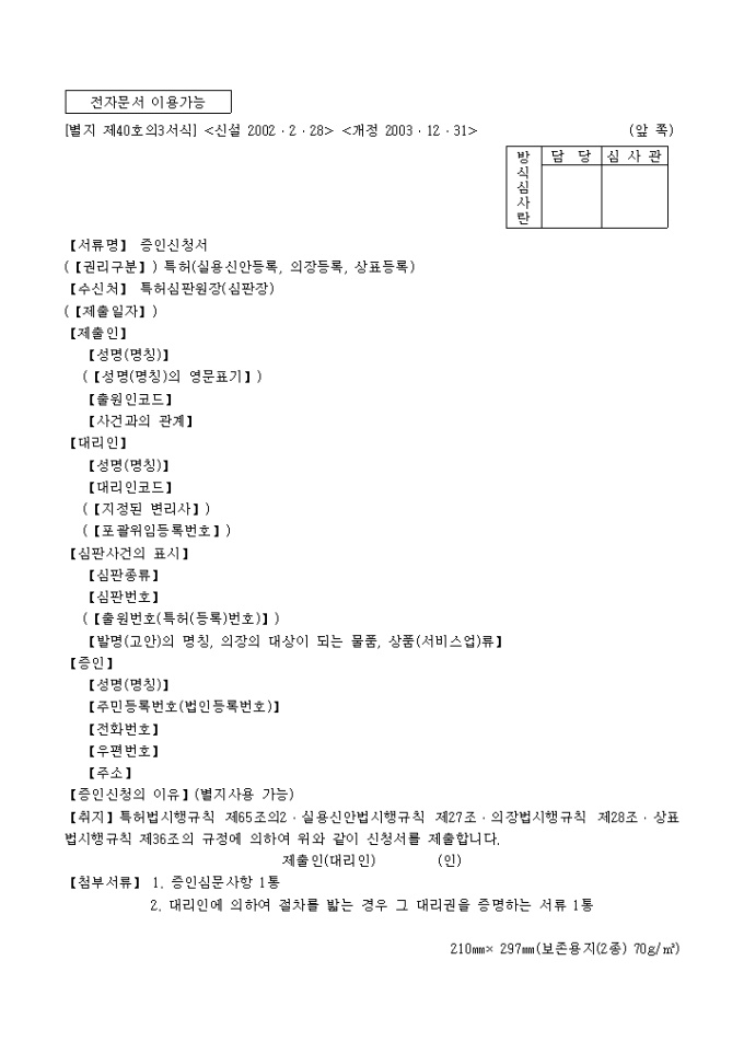 특허법시행규칙 제65조의2·실용신안법시행규칙 제27조·의장법시행규칙 제28조·상표법시행규칙 제36조의 규정에 의거한 증인신청서 입니다. 증인심문사항 1통, 대리인에 의하여 절차를 밟는 경우 그 대리권을 증명하는 서류 1통이 첨부되어야 합니다.