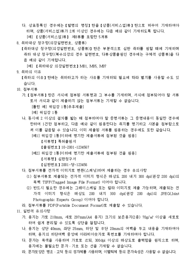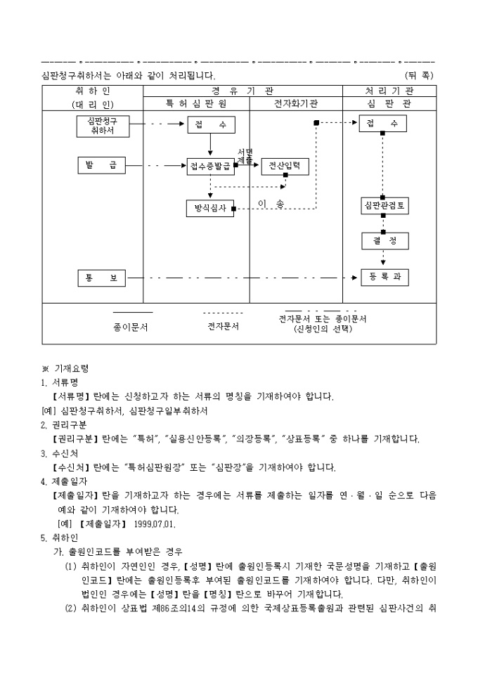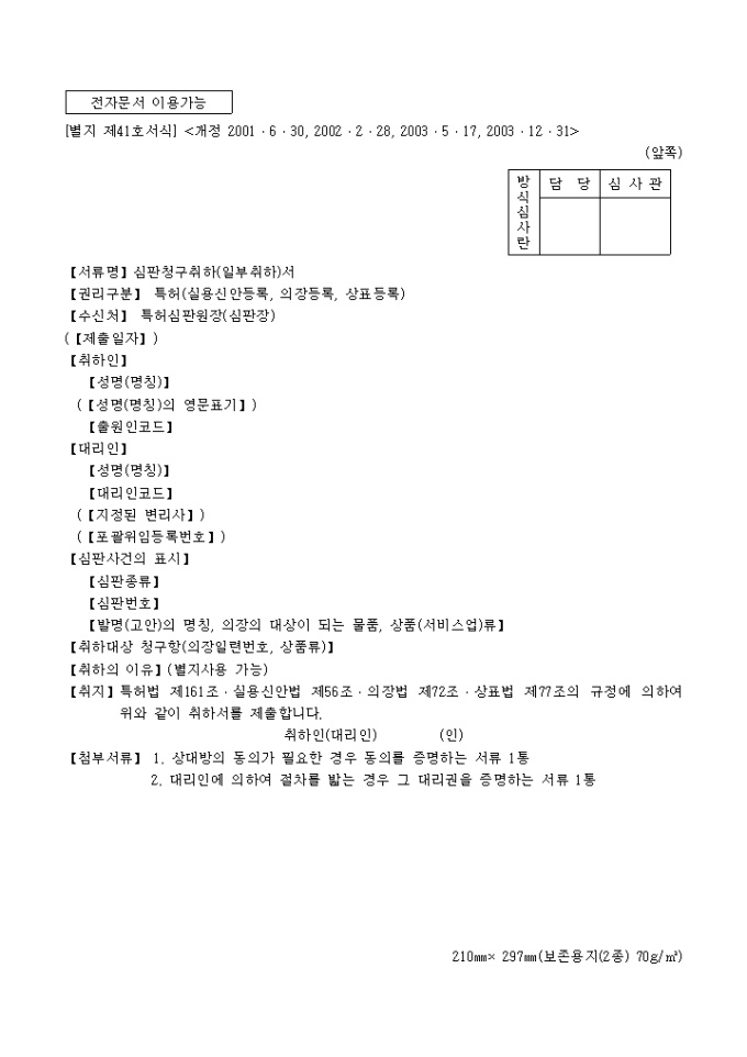 9,000원/월특허법 제161조·실용신안법 제56조·의장법 제72조·상표법 제77조의 규정에 의거한 심판청구취하(일부취하)서 입니다. 상대방의 동의가 필요한 경우 동의를 증명하는 서류 1통, 대리인에 의하여 절차를 밟는 경우 그 대리권을 증명하는 서류 1통이 첨부되어야 합니다.