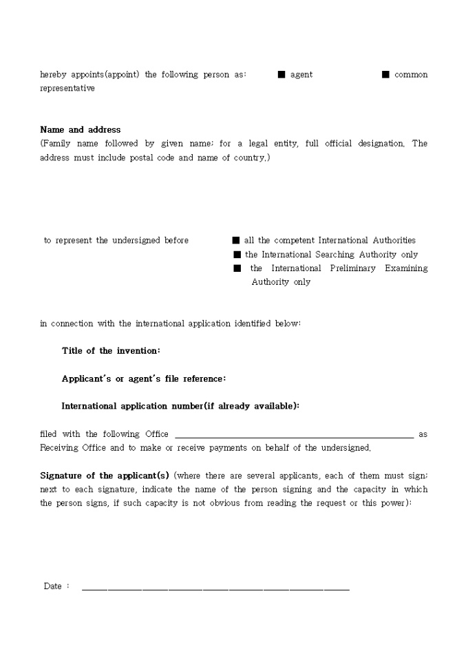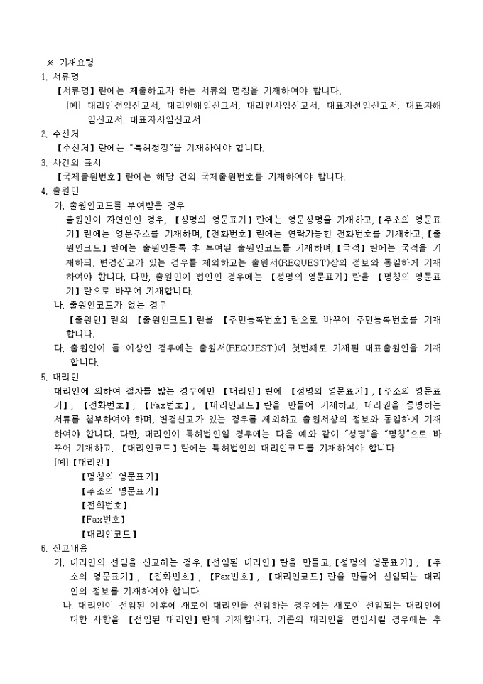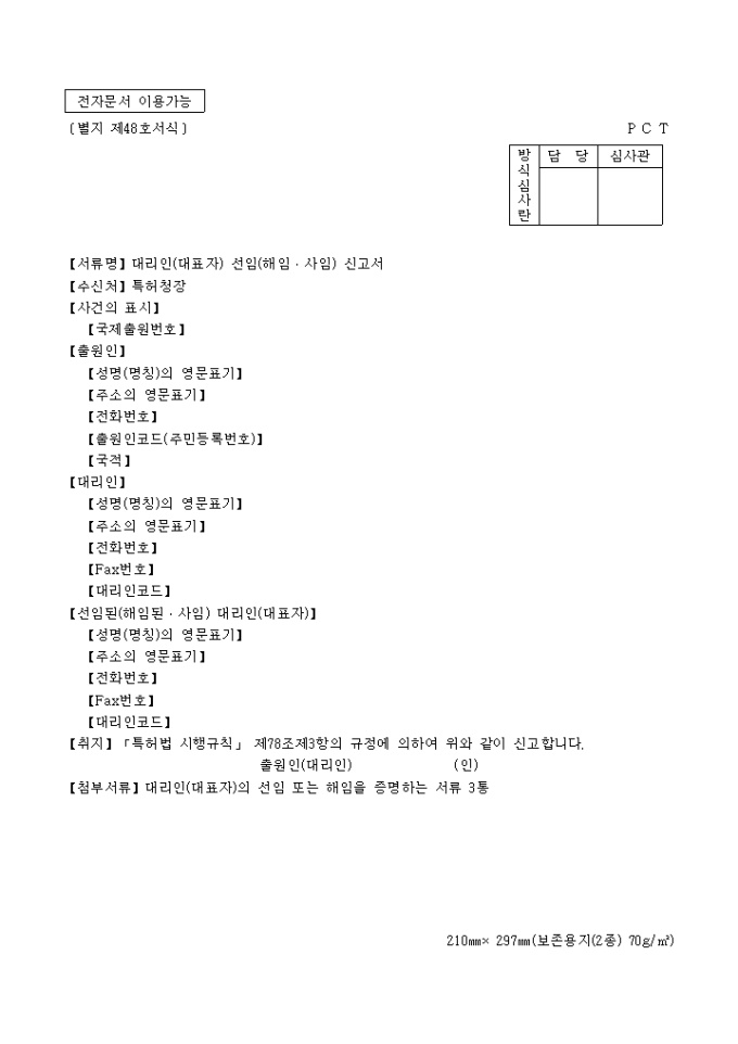 9,000원/월´특허법 시행규칙´ 제78조제3항의 규정에 의거한 대리인(대표자) 선임(해임,사임) 신고서 입니다. 대리인(대표자)의 선임 또는 해임을 증명하는 서류 3통이 첨부되어야 합니다.