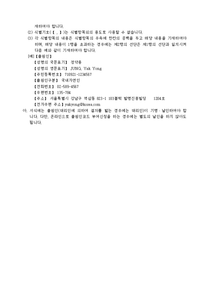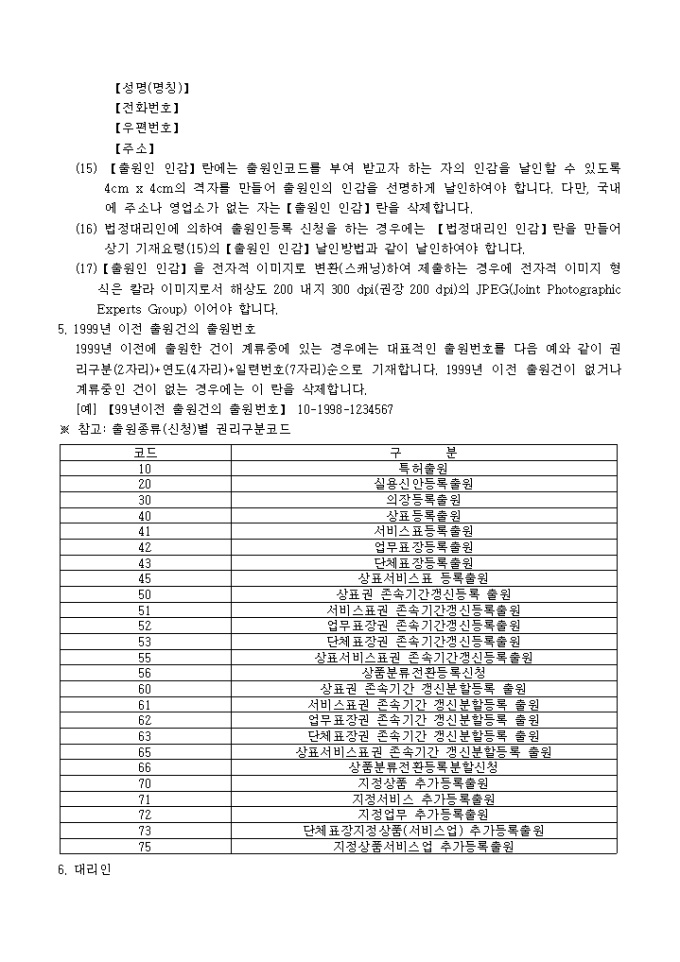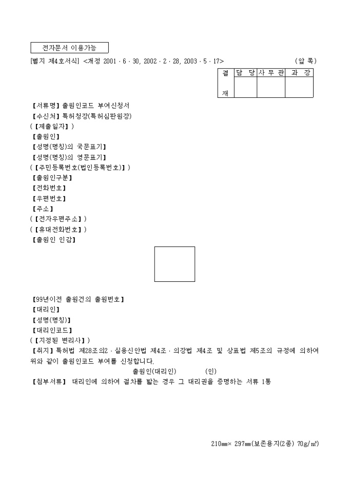 9,000원/월특허법 제28조의2·실용신안법 제4조·의장법 제4조 및 상표법 제5조의 규정에 의거한 출원인 코드부여 신청서입니다. 대리인에 의하여 절차를 밟는 경우 그 대리권을 증명하는 서류 1통이 첨부되어야 합니다.