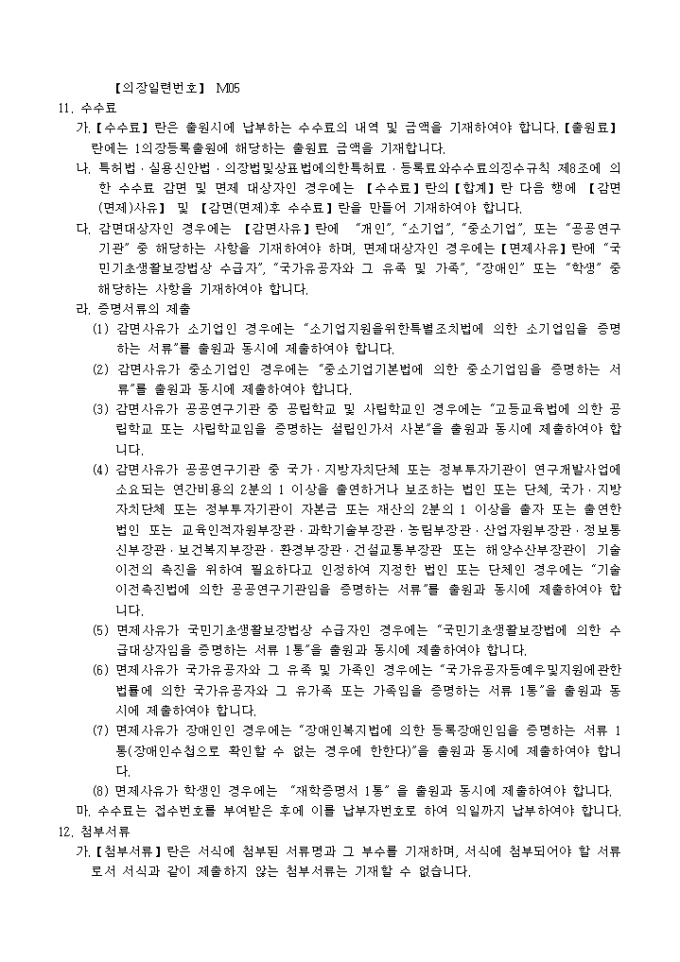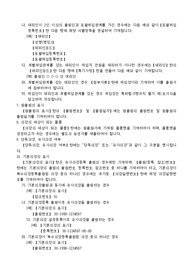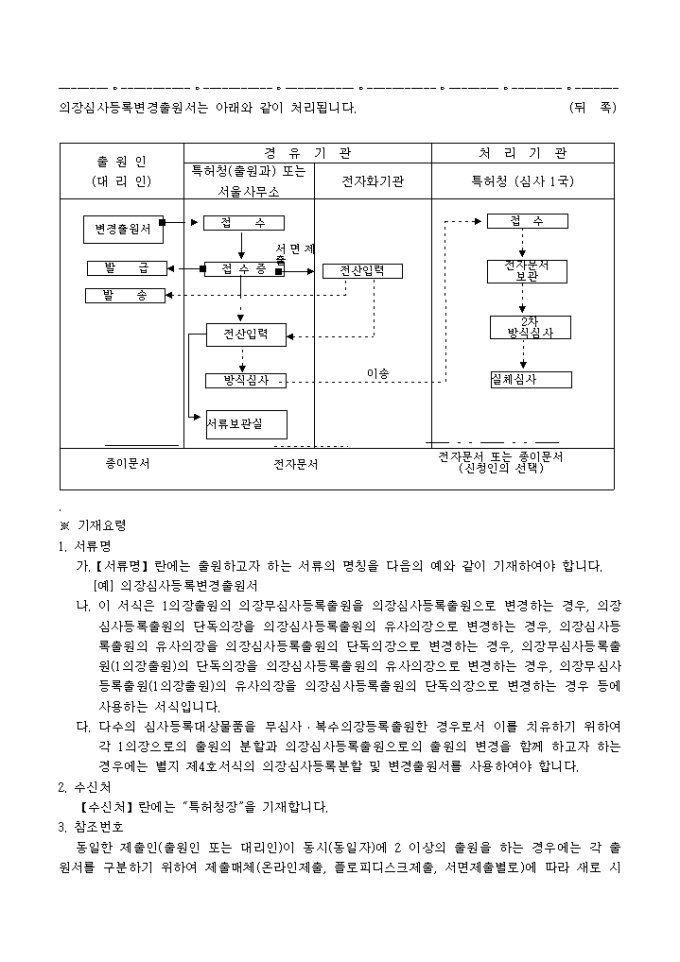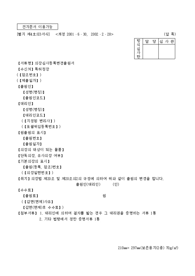 의장법 제20조 및 제20조의2의 규정에 의거한 의장심사등록변경출원서 입니다. 대리인에 의하여 절차를 밟는 경우 그 대리권을 증명하는 서류 1통, 기타 법령에서 정한 증명서류 1통이 첨부되어야 합니다.