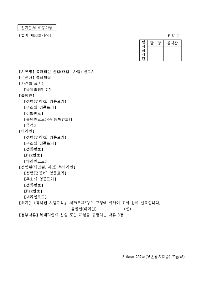 「특허법 시행규칙」제79조제2항의 규정에 의거한 복대리인 선임(해임·사임) 신고서 입니다. 복대리인의 선임 또는 해임을 증명하는 서류 3통이 첨부되어야 합니다.