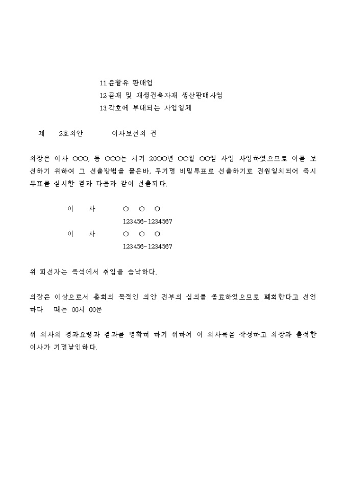 정관일부의 변경 및 이사보선에 관한 사항을 결의하는 임시주주총회의 의사록입니다.