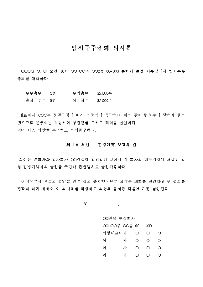 9,000원/월합병계약에 대한 보고와 그것을 승인하는 임시주주총회의 의사록입니다.