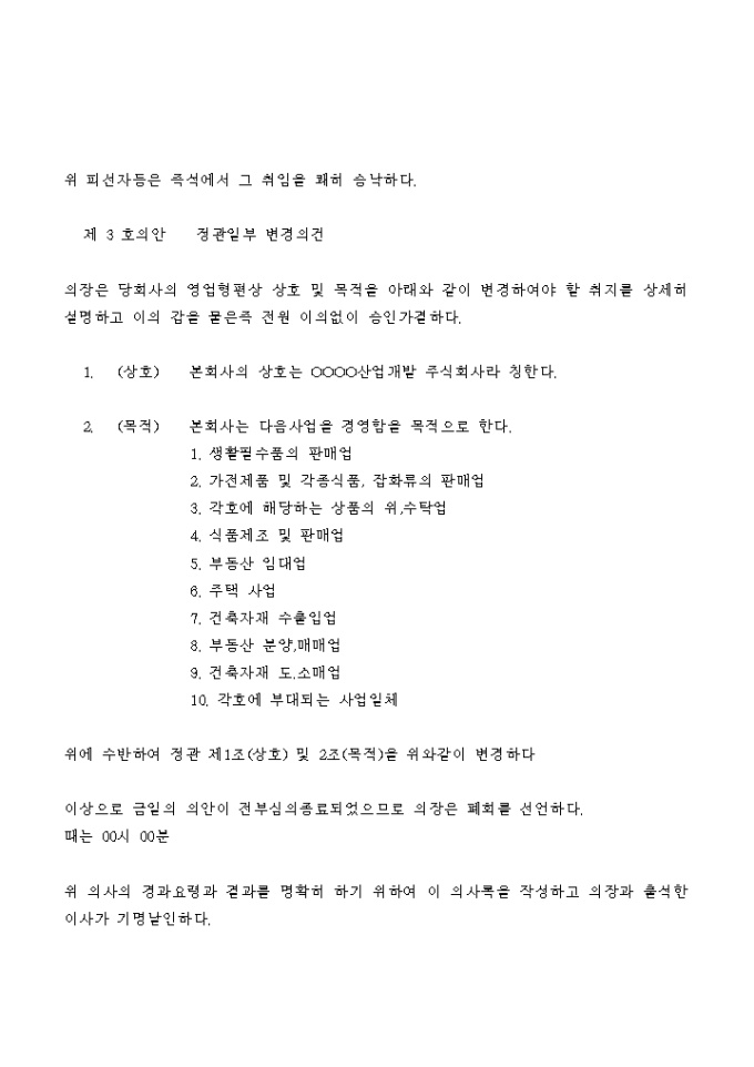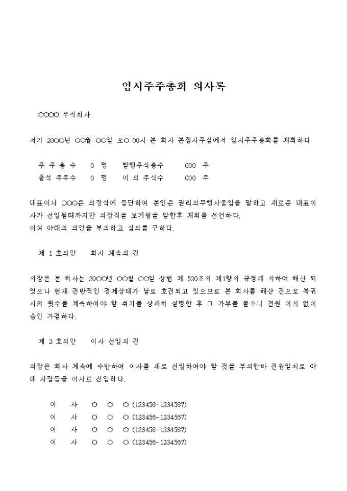 9,000원/월회사의 계속,이사선임 및 정관의 일부변경을 결의하는 임시주주총회의 의사록입니다.