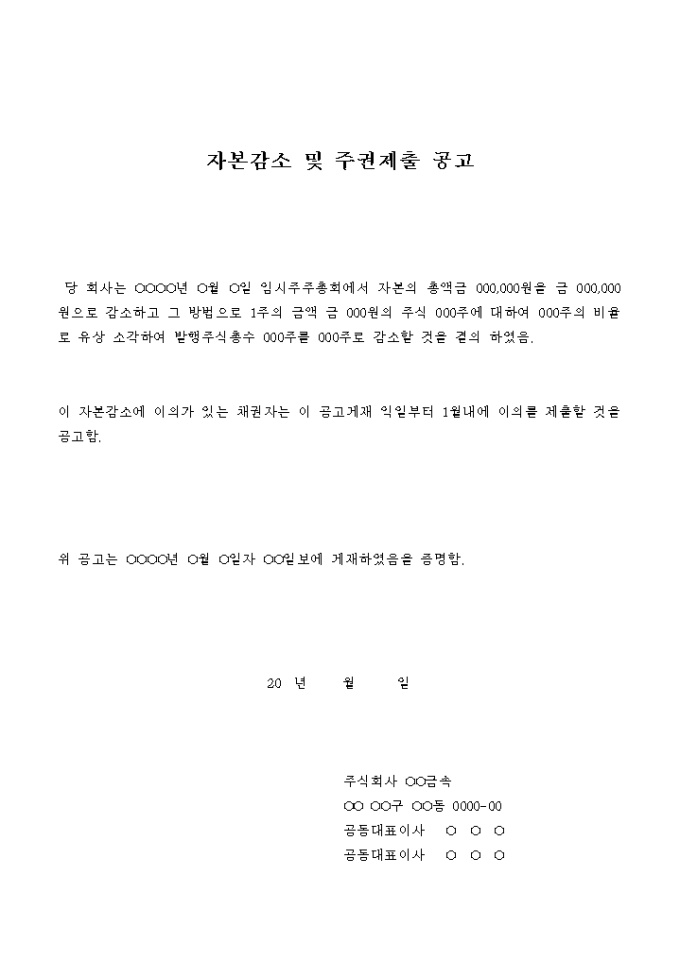 9,000원/월회사의 자본감소 및 주권을 제출할 것을 공고하는 서식입니다.