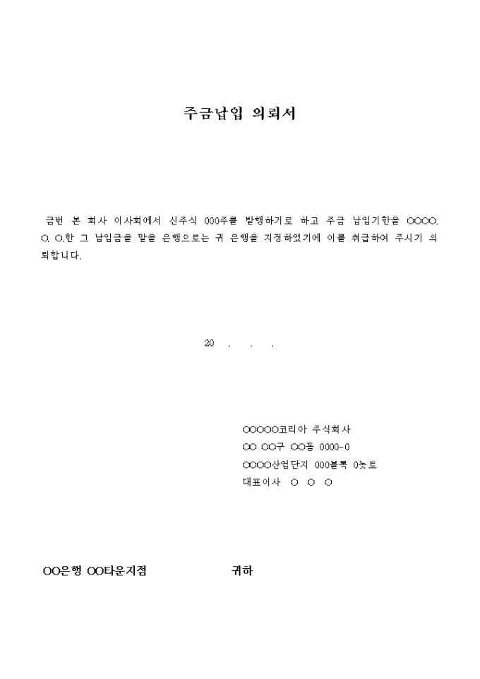 이사회에서 신주식을 발행하기로 하였음을 원인으로 주식납입금을 맡아 줄것을 은행에 의뢰하는 의뢰서입니다.