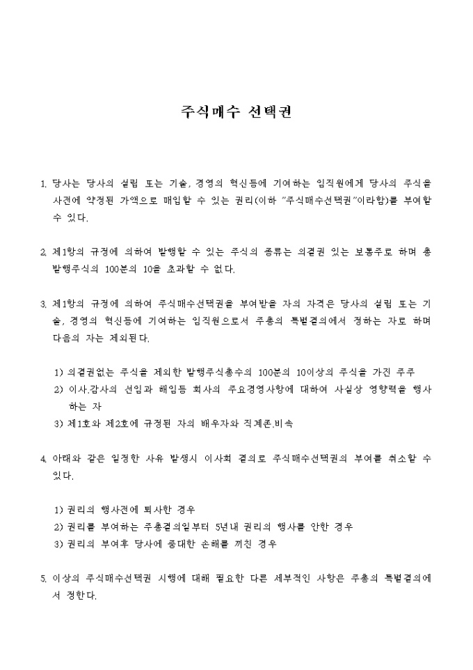 9,000원/월회사의 설립 또는 기술, 경영의 혁신등에 기여하는 임직원에게 회사의 주식을 사전에 약정된 가액으로 매입할 수 있는 권리(이하 "주식매수선택권"이라함)를 부여하는 것에 대한 사항을 적은 것입니다.