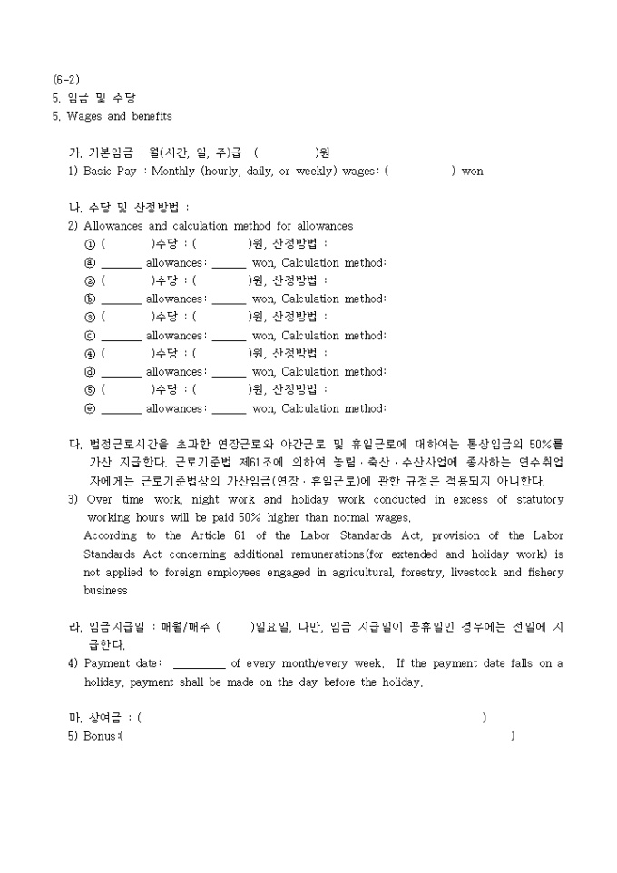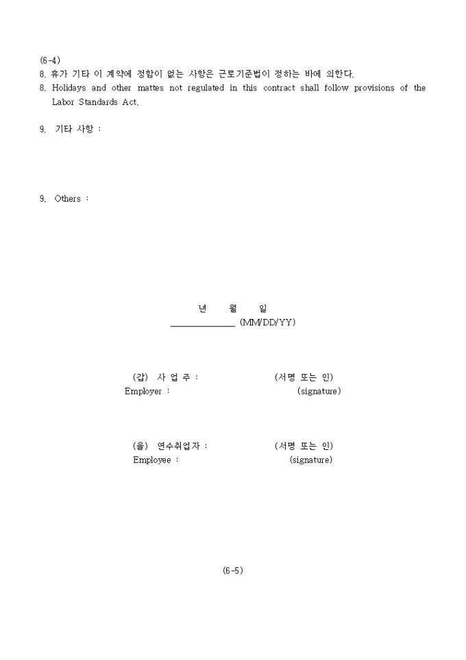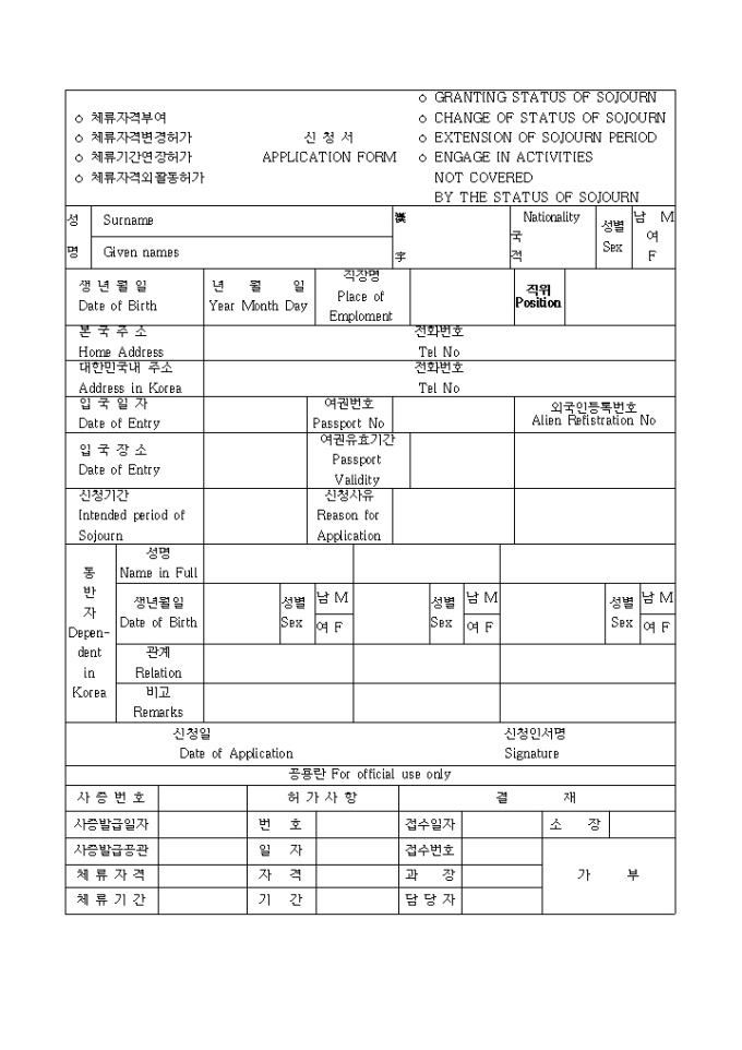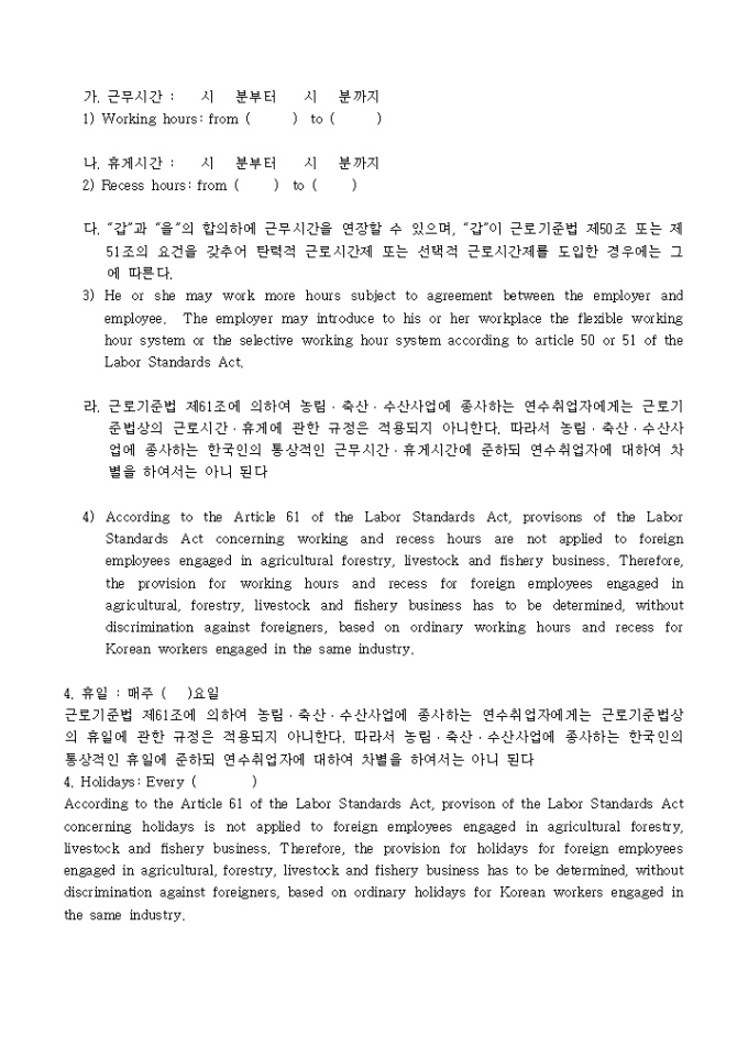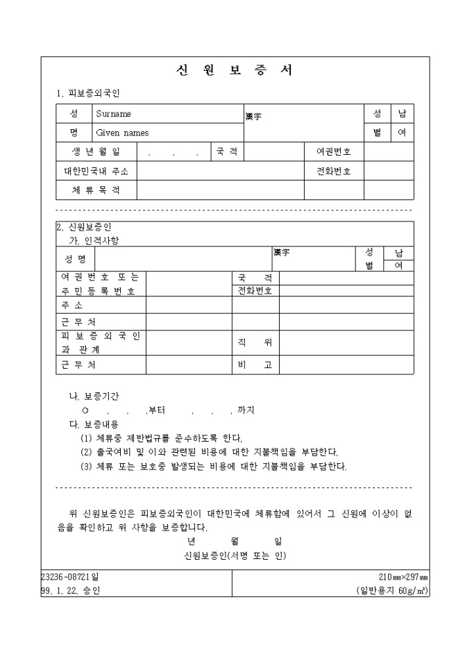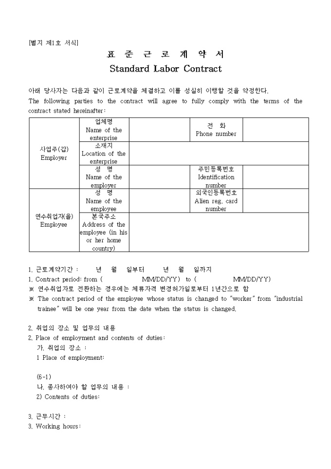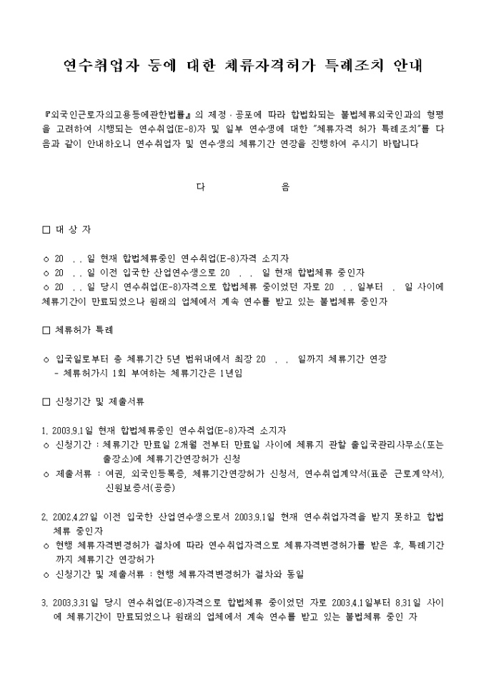 9,000원/월『외국인근로자의고용등에관한법률』의 제정ㆍ공포에 따라 합법화되는 불법체류외국인과의 형평을 고려하여 시행되는 연수취업(E-8)자 및 일부 연수생에 대한 "체류자격 허가 특례조치" 안내문과 영문신청서, 신원보증서, 표준근로계약서로 구성되어 있습니다.