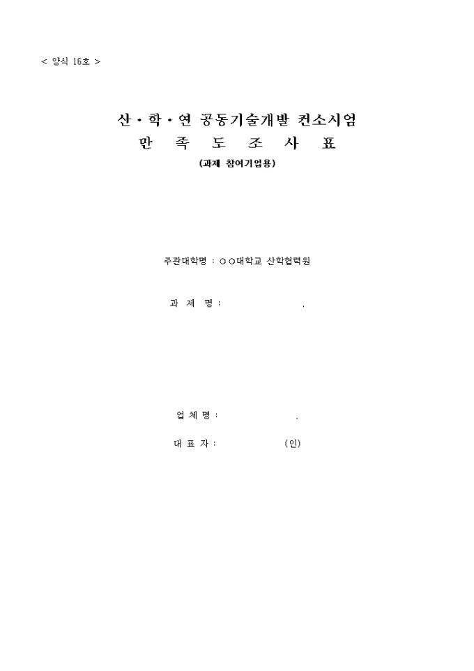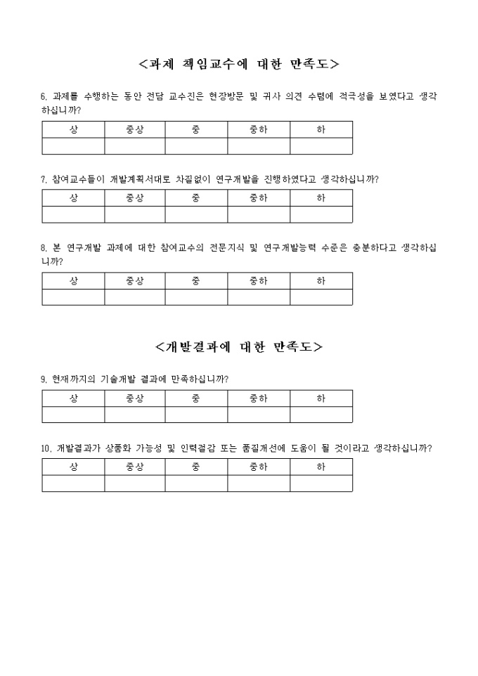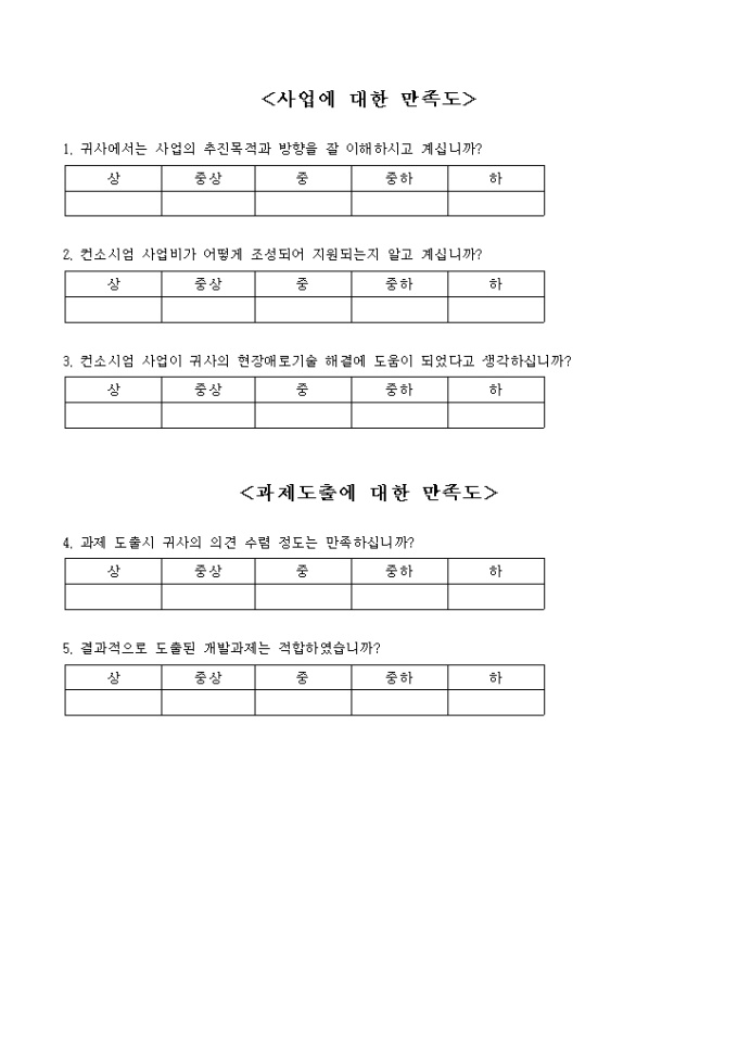 9,000원/월사업에 대한 만족도. 과제도출에 대한 만족도. 과제 책임교수에 대한 만족도. 개발결과에 대한 만족도에 대한 질문으로 구성된 산학연공동기술개발 컨소시엄 만족도 조사표 입니다.