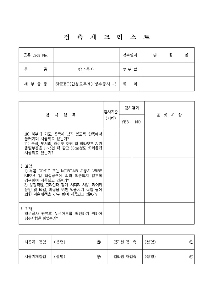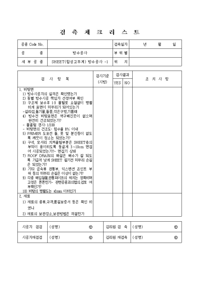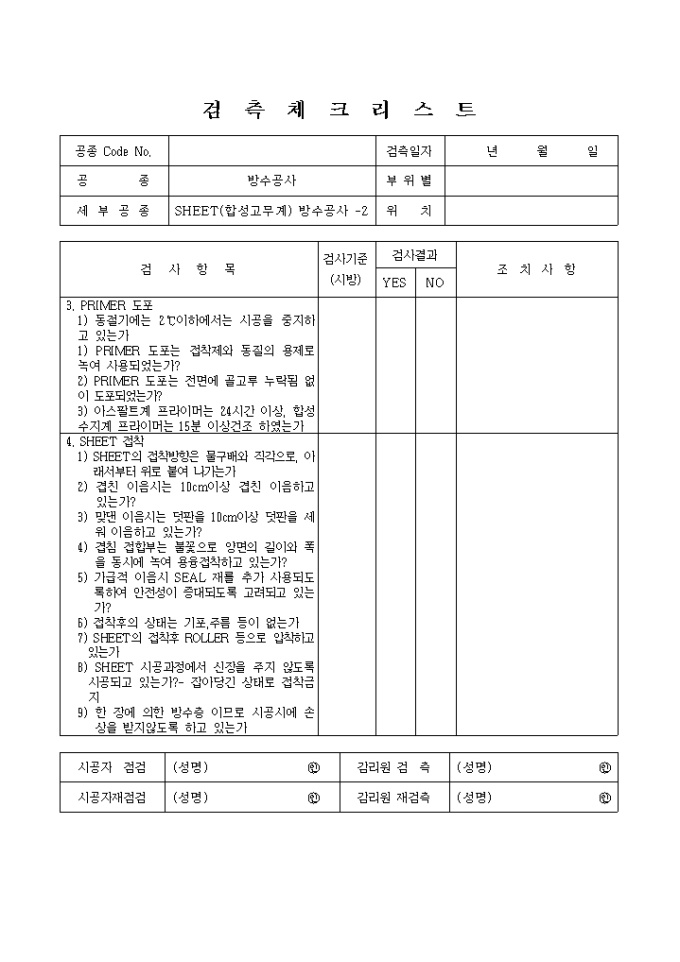 9,000원/월바탕면(방수시공자의 실적은 확인했는가, 동별 방수시공 책임자 선정여부 확인 등), 재료(재료의 종류, 규격, 품질보증서 등은 확인 하였나, 재료의 보관장소,보관방법은 적절한가), PRIMER 도포(동절기에는 2℃이하에서는 시공을 중지하고 있는가, PRIMER 도포는 접착제와 동질의 용제로 녹여 사용되었는가? 등), SHEET 접착(맞댄 이음시는 덧판을 10cm이상 덧판을 세워 이음하고 있는가?, 겹친 이음시는 10cm이상 겹친 이음하고 있는가? 등) 등의 검사항목으로 구성된 검측 체크리스트 입니다.