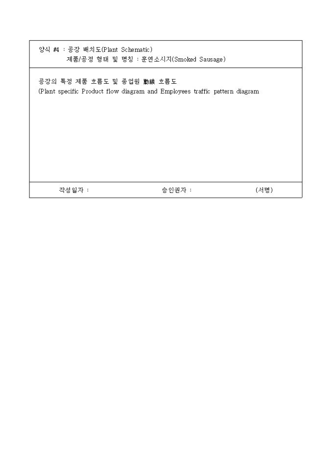 공장의 특정 제품 흐름도 및 종업원 動線 흐름도, 작성일일자, 승인권자(서명) 등의 항목으로 구성된 공장 배치도 입니다.
