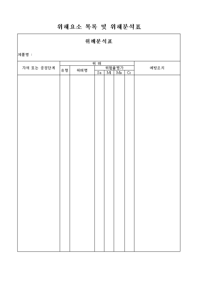 9,000원/월자재 또는 공정단계, 위해(유형, 위해명, 위해율평가), 예방조치 등의 항목으로 구성된 위해요소 목록 및 위해분석표 입니다.