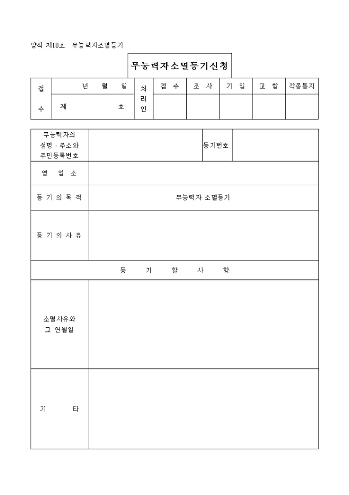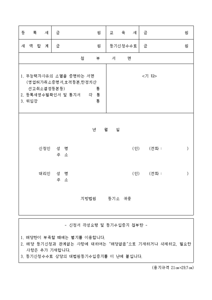 9,000원/월무능력자 의 성명, 주소와 주민등록번호, 영업소, 등기의 목적, 등기의 사유 등을 기입하며 첨부서류로는 무능력자사유의 소멸을 증명하는 서면, (영업허가취소증명서,호적등본,한정치산