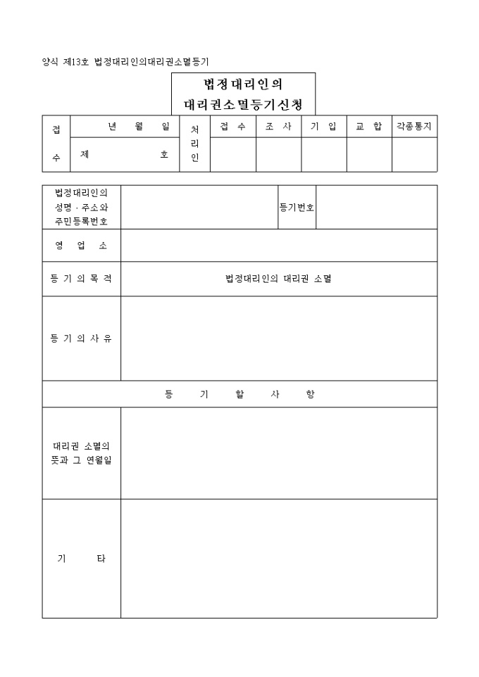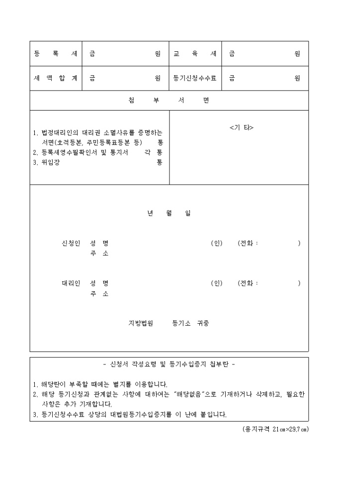 9,000원/월법정대리인의 성명, 주소와 주민등록번호, 영업소, 등기의 목적, 등기의 사유등을 기입하며 필요한 서류로는 법정대리인의 대리권 소멸사유를 증명하는 서면(호적등본, 주민등록표등본 등), 등록세영수필확인서 및 통지서, 위임장이 있습니다.