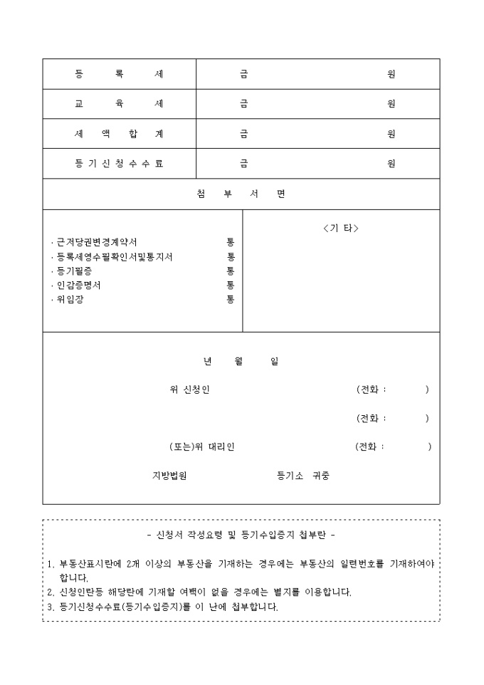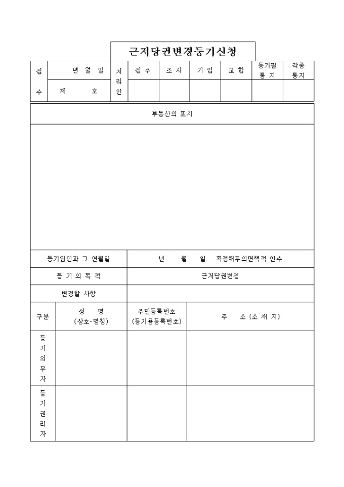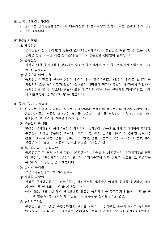 9,000원/월근저당권설정등기 후 채무자변경 등 등기사항의 변동이 있는 경우의 등기 신청에 관한 것입니다. 근저당권변경계약서, 등록세영수필확인서및통지서, 등기필증, 인감증명서, 위임장이 첨부되어야 합니다.