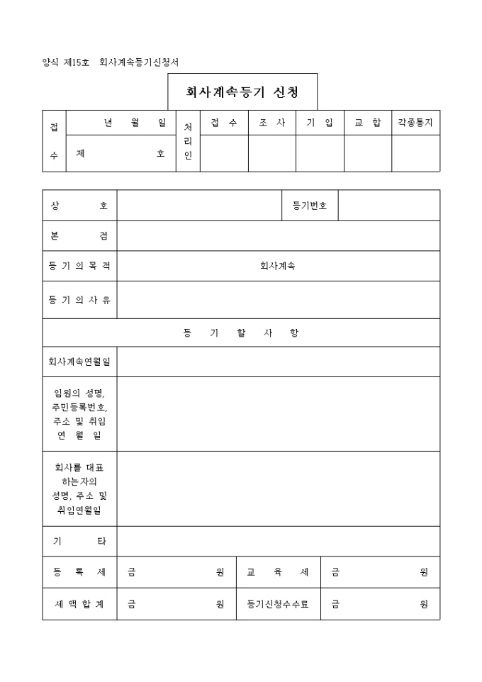 9,000원/월상호명, 본점, 등기의 목적, 등기의 사유, 회사계속연월일, 임원의 성명, 주민등록번호, 주소 및 위임연월일 등을 기입합니다.