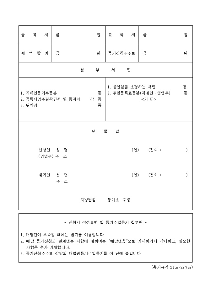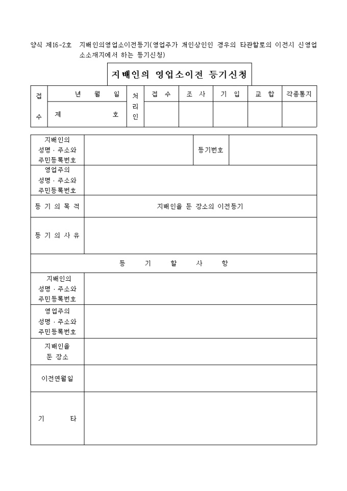 9,000원/월지배인의영업소이전등기(영업주가 개인상인인 경우의 타관할로의 이전시 신영업소소재지에서 하는 등기신청)입니다.