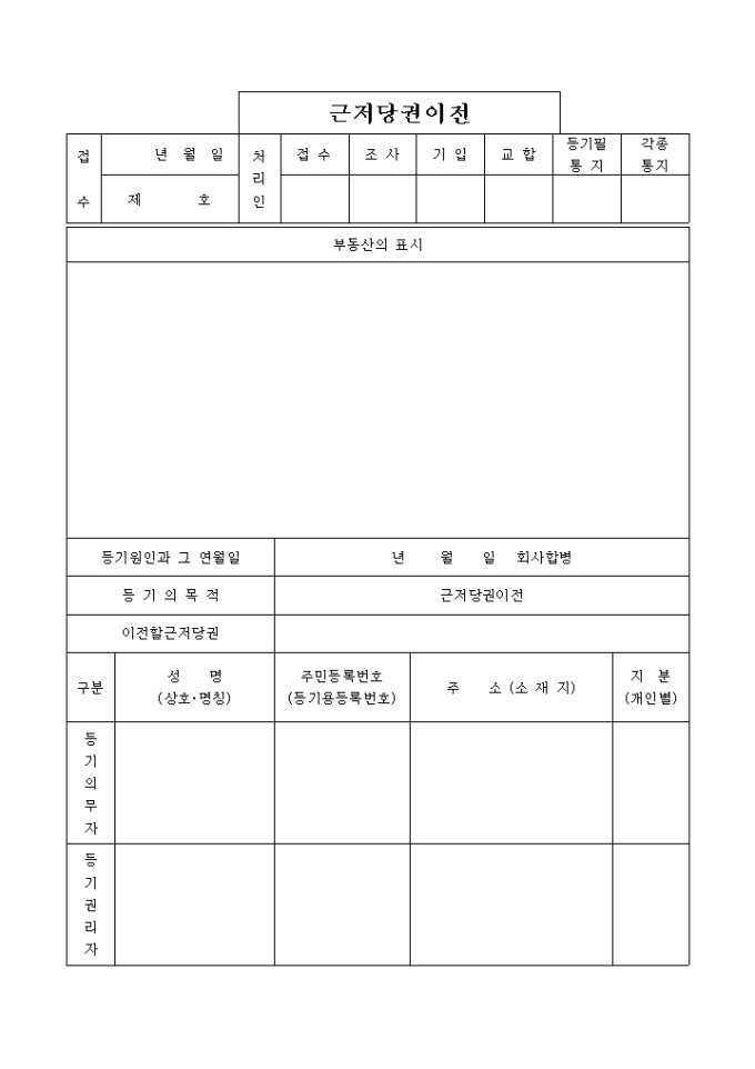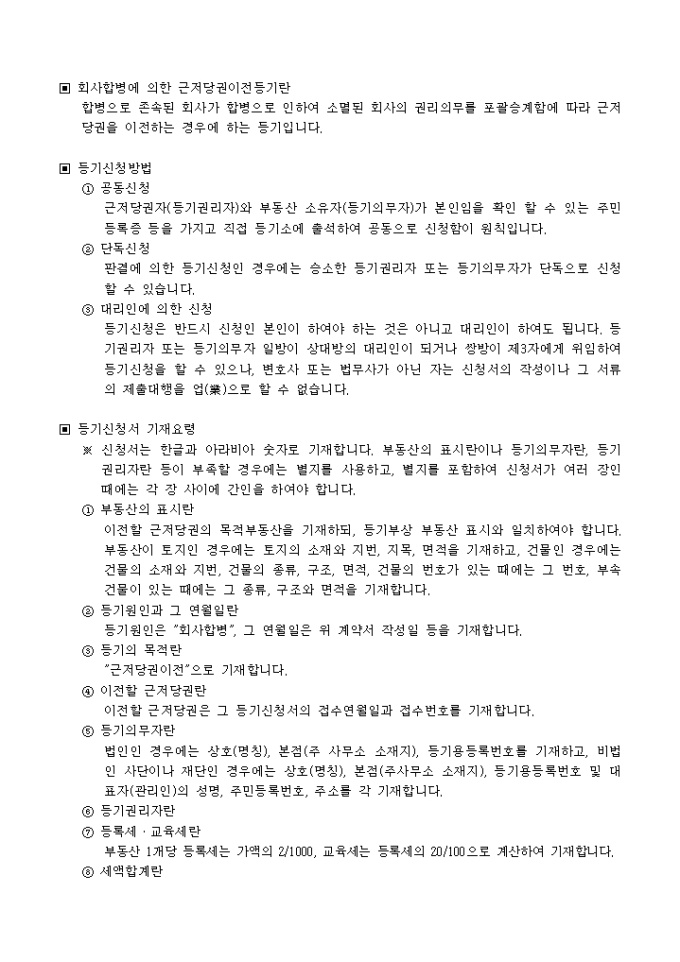 9,000원/월합병으로 존속된 회사가 합병으로 인하여 소멸된 회사의 권리의무를 포괄승계함에 따라 근저당권을 이전하는 경우에 하는 등기입니다. 등록세영수필확인서 및 통지서, 법인등기부등(초)본, 위임장이 첨부되어야 합니다.