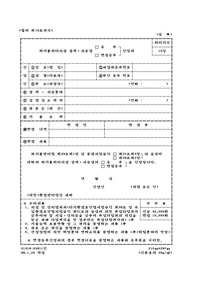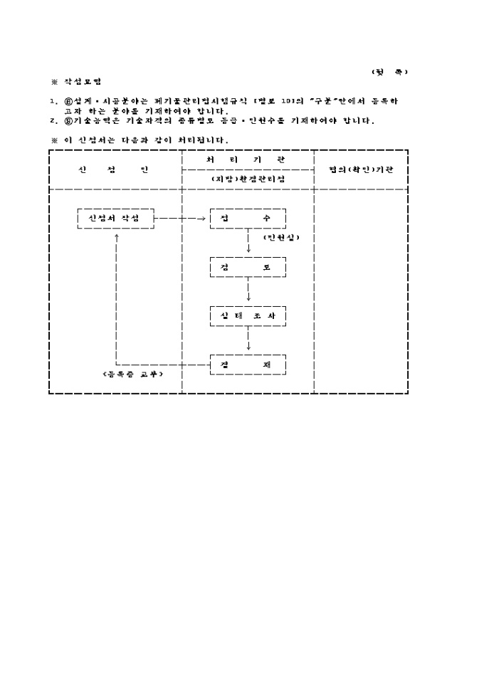 9,000원/월폐기물관리법 제33조제1항 및 동법시행규칙 (□ 제27조제2항□ 제28조제2항)의 규정에 의하여 폐기물처리시설 설계.시공업의 (□ 등록 □ 변경등록)을 신청을 신청할 때 사용하는 "폐기물 처리 시설설계·시공업 (등록,변경등록)신청서" 양식입니다.