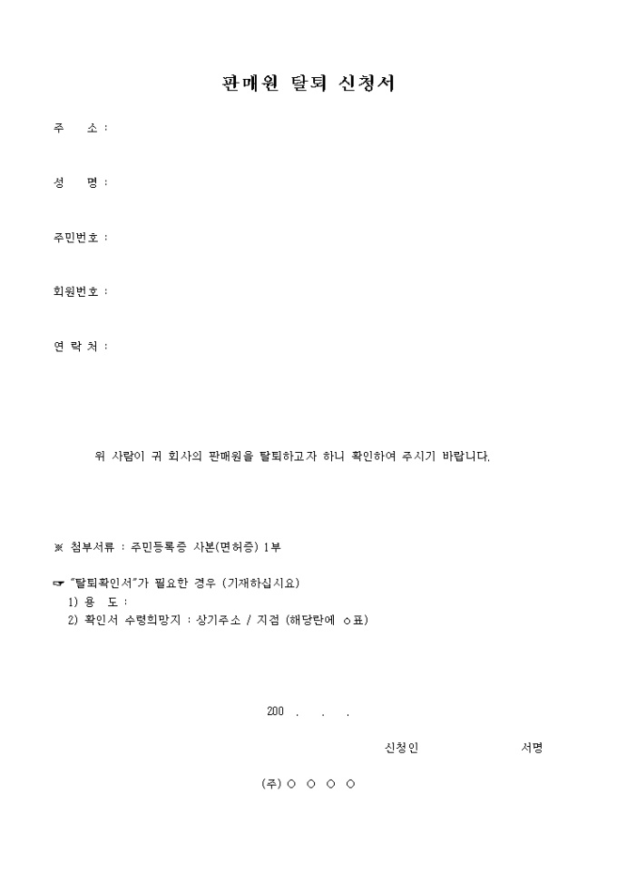 주소, 성명, 주민번호, 회원번호, 연락처 등을 기록하고 회사의 판매원 탈퇴 신청시 필요한 양식입니다.