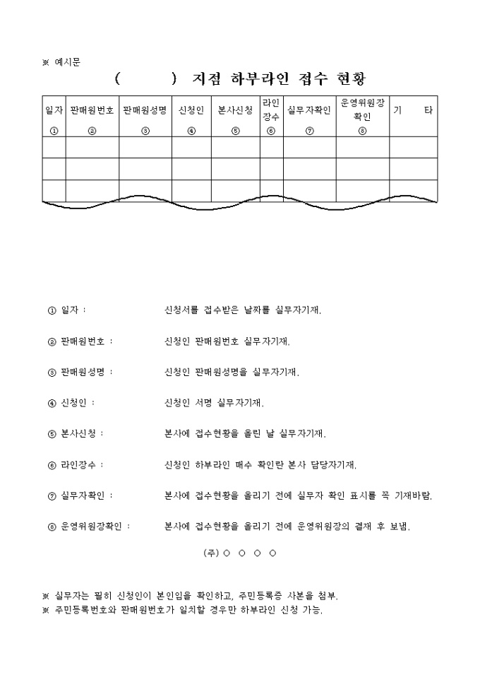 9,000원/월일자, 판매원번호, 판매원성명, 신청인, 본사신청, 라인장수, 실무자확인, 운영위원장확인란으로 구성된 하부라인 접수 현황 기록 양식입니다.