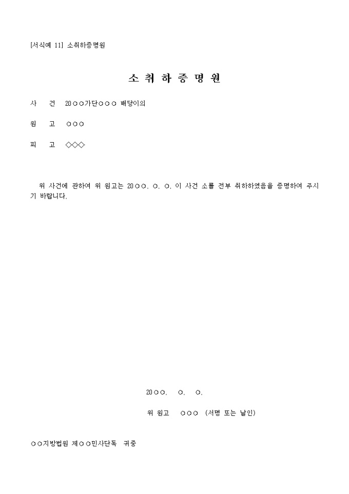 9,000원/월사건 : 20○○가단○○○ 배당이의 원고 : ○○○ 피고 : ◇◇◇ 위 사건에 관하여 위 원고는 20○○. ○. ○. 이 사건 소를 전부 취하하였음을 증명하여 주시기 바랍니다.
