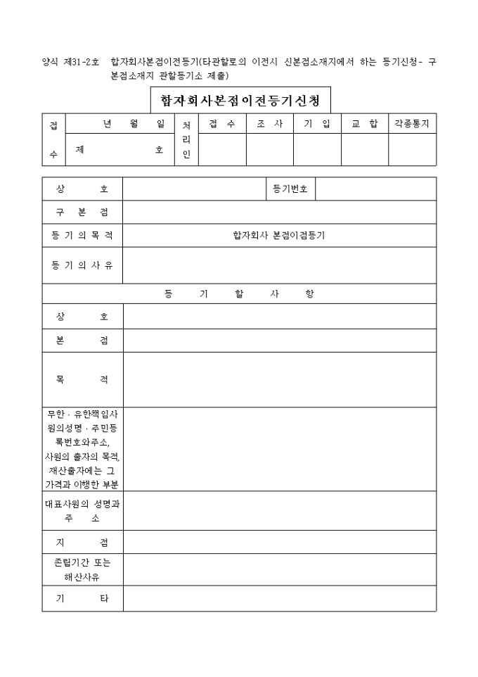 9,000원/월합자회사본점이전등기(타관할로의 이전시 신본점소재지에서 하는 등기신청- 구본점소재지 관할등기소 제출)로서 상호, 구본점, 등기의 목적, 등기의 사유 등기할 사항 등을 기입하며 필요한 서류로는 인감신고서, 등록세 영수필 확인서 및 통지서, 위임장이 있습니다.