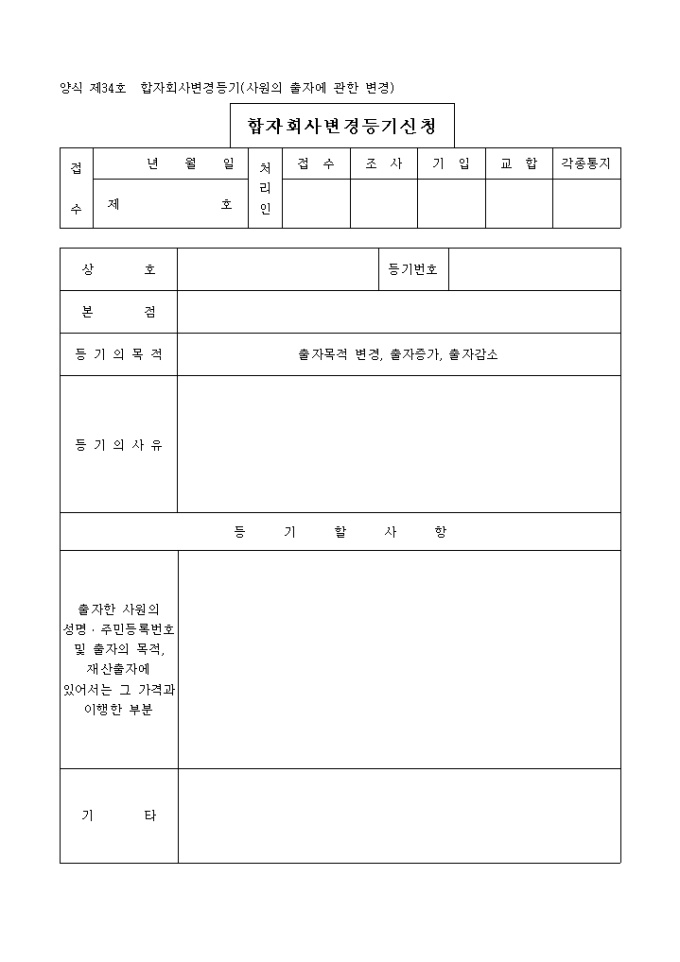 9,000원/월상호, 본점, 등기의 목적, 등기할 사항등을 기입하며 필요한 서류로는 총사원동의서, 출자이행증명서(출자의 목적변경 또는